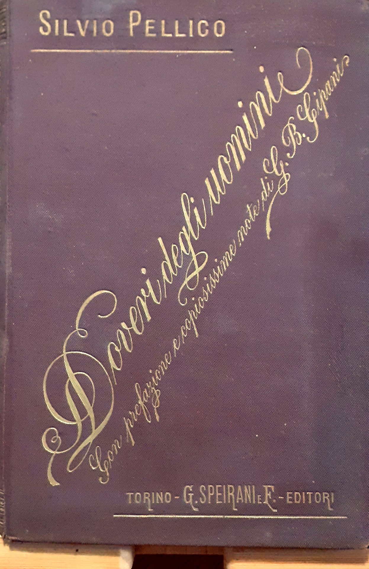 II ed. In-16 grande, pp. 176, rilegatura in cartone telato con titoli oro al piatto e al dorso. In antiporta ritratto in nero di S. Pellico. Stato buono (firma e appunti di possesso della fine dell'800 a inchiostro nel primo foglio di guardia, Collegio Convitto Municipale di Alassio Anno scolastico 1993/94 secondo premio di studio).
