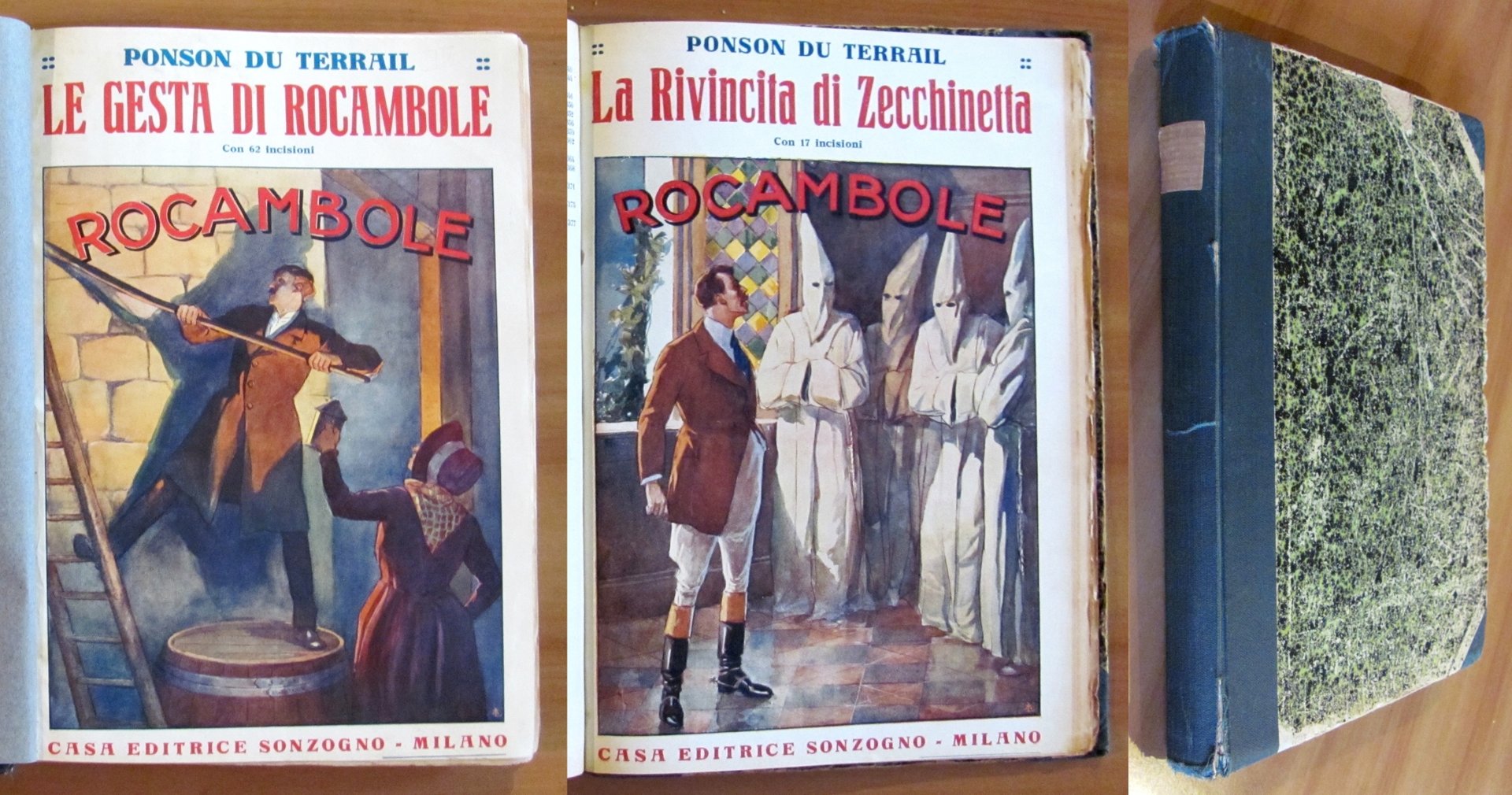 Belle copertine a colori e molte illustrazioni in b/n n.t., anche a piena pagina, in ciascun titolo. Casa Editrice Sonzogno - Milano, 1909. Rilegatura coeva in mezza tela con copertine in brossura originali conservate all'interno. Alcune pagine presentano taglietti e imperfezioni ai margini esterni e le pagine 175/178 risultano slegate alla cerniera e la sola pagina 175 ha un taglio trasversale al margine esterno. 20,5x28,5; pp.384+104. Rari e in Buono stato. , Buono (Good)