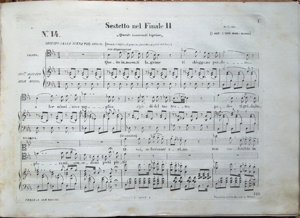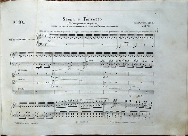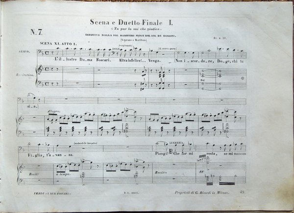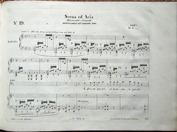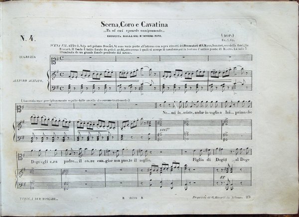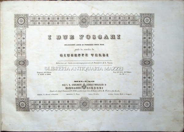 I due Foscari. Melodramma lirico di Francesco Maria Piave posto in musica da Giuseppe Verdi. Riduzione per Canto con accompagnamento di Pianoforte di L. Truzzi. Proprietà dell'Editore, N. 16797 al 16815. Reg. nell'Arch. dell'Unione, Fr. 32 -