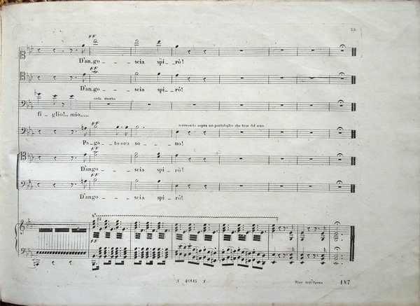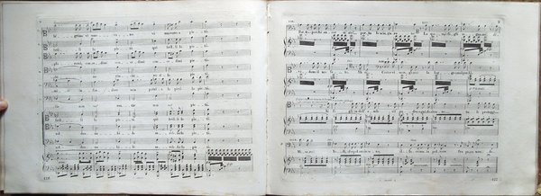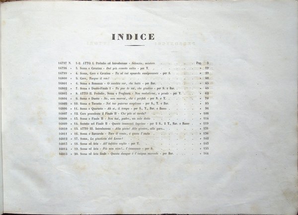 In-8° oblungo (25 x 35,1 cm), pp. 187, (1), legatura coeva in mezza pergamena. Tracce d'uso e del tempo alla legatura, in particolare, mancanza del dorso, sostituito da rinforzo in carta giapponese da recente intervento di restauro e abrasioni agli angoli dei piatti. Tagli decorati a spruzzo. Pochi, piccoli, lievi segni d'umido al frontespizio e a qualche pagina. Piccoli strappi, senza perdite, ben rimarginati con carta giapponese, nei bordi dei fogli con le pagine dalla 31 alla 38, 53-54, 81-82, 117-118, 161-162, 167-168, 177-178. Reintegrato, sempre con carta giapponese, l'angolo inferiore esterno del foglio con le pagine 73-74. Per il resto, ben conservato. Pagina 3 ospita l'indice, pagina 4 i personaggi del melodramma, con gli attori della prima rappresentazione, andata in scena al Teatro Argentina di Roma il 3 novembre 1844; alle pagine 5-187 è contenuto, inciso, lo spartito. Rara variante della prima edizione completa della seconda versione dell'opera verdiana, Hopkinson 42 B (b): tra le differenze rispetto alle copie della prima tiratura, la cui uscita era stata pubblicizzata sulla Gazzetta Musicale di Milano del 10 agosto 1845, un nuovo frontespizio, con differente incorniciatura, in nero, e il nome dell'editore Escudier, al posto di Blanchet, quale agente a Parigi, Escudier cui Verdi aveva ceduto i diritti dei suoi lavori, per la Francia, nell'ottobre del 1845. Pubblicata, per la prima volta, nel 1844, in diciannove fascicoli sciolti (numeri di catalogo Ricordi dal 16797 al 16815), ciascuno con frontespizio, indicazione di prezzo e numerazione propri, con il titolo di I due Foscari. Tragedia lirica di Francesco Maria Piave posta in musica da Giuseppe Verdi. Riduzione per Canto con accompagnamento di Pianoforte del maestro L. Truzzi, l'opera venne riproposta l'anno seguente, come volume unitario, ristampando i fascicoli della precedente prima edizione, le sole parti con la musica, inserendo una nuova numerazione progressiva (anche se le tavole con lo spartito, oltre al prezzo, conservano la numerazione interna ai singoli fascicoli), e nuovi frontespizio e indice. Personaggi e attori: Francesco Foscari, Doge di Venezia, ottuagenario, Achille De Bassini (Baritono); Jacopo Foscari, suo figlio, Giacomo Roppa (Primo Tenore); Lucrezia Contarini, di lui moglie, Marianna Barbieri Nini (Prima Donna Soprano); Jacopo Loredano, membro del Consiglio de' Dieci, Baldassare Mirri (Basso comprimario); Barbarigo, Senatore, membro della Giunta, Atanasio Pozzolini (Secondo Tenore); Pisana, amica e confidente di Lucrezia, Giulia Ricci (Seconda Donna); Fante del Consiglio de' Dieci, N. N. (Secondo Tenore); Servo del Doge, N. N. (Secondo Basso). Cori: Membri del Consiglio dei Dieci e Giunta, Ancelle di Lucrezia, Dame veneziane, Popolo e Maschere d'ambo i sessi; Comparse: il Messer grande, due figliuoletti di Jacopo Foscari, Comandadori, Carcerieri, Gondolieri, Marinai, Popolo, Maschere, Paggi del Doge. La scena è in Venezia, l'epoca il 1457. Indice: 16797. N. 1-2. Àtto I. Preludio ed Introduzione, Silenzio, mistero. 16798. N. 3. Scena e Cavatina, Dal più remoto esilio, per T. 16799. N. 4. Scena, Coro e Cavatina, Tu al cui sguardo onnipossente, per S. 16800. N. 5. Coro, Tacque il reo! 16801. N. 6. Scena e Romanza, O vecchio cor, che batti, per Bar. 16802. N. 7. Scena e Duetto-Finale I, Tu pur lo sai, che giudice, per S. e Bar. 16803. N. 8. Atto II. Preludio, Scena e Preghiera, Non maledirmi, o prode, per T. 16804. N. 9. Scena e Duetto, No, non morrai, chè i perfidi, per S. e T. 16805. N. 10. Scena e Terzetto, Nel tuo paterno amplesso, per S., T. e Bar. 16806. N. 11. Scena e Quartetto, Ah sì, il tempo, per S., T., Bar. e Basso. 16807. N. 12. Coro precedente il Finale II, Che più si tarda? 16808. N. 13. Scena e Finale II, Non hai, padre, un solo detto. 16809. N. 14. Sestetto nel Finale II, Queste innocenti lagrime, per 2 S., 2 T., Bar. e Basso. 16810. N. 15. Atto III. Introduzione, Alla gioja! Alle giostre, alle gare. 16811. N. 16. Scena e Barcarola, Tace il vento, è queta l'onda. 16812. N. 17. Scena, La giustizia del Leone! 16813. N. 18. Scena ed Aria, All'infelice veglio, per T. 16814. N. 19. Scena ed Aria, Più non vive!… l'innocente, per S. 16815. N. 20. Scena ed Aria finale, Questa dunque è l'iniqua mercede, per Bar.