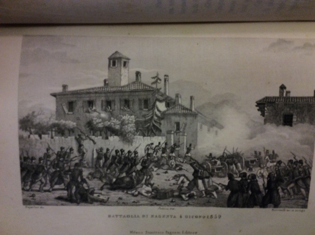 In-8 (mm. 235x150), mz. pelle mod. con ang., fregi e titolo oro al dorso, conserv. la brossura orig. figurata (restaur. per mancanza al piatto poster.), pp. 77,(3), testo entro doppio filetto, molto ben illustrato fuori testo da tavole inc. in acciaio da Gandini, su disegno di Najmiller; ornato da pregevoli fregi. Questa piccola raccolta di saggi storici è così composta:- Vittorio Emanuele I, con ill ritratto del Re d'Italia e una tavola che raffigura la battaglia di Solferino, il 24 giugno 1859 - Giuseppe Garibaldi, con il ritratto dell'eroe del nostro Risorgimento e una tavola con l'attacco del forte di Laveno sul lago Maggiore da' Cacciatori delle Alpi - Camillo Benso Conte di Cavour, con il suo ritratto - Napoleone III, con il ritratto dell'Imperatore dei Francesi e una tavola sulla battaglia di Magenta, 4 giugno 1859.Qualche lieve traccia d'uso ma certamente un buon esemplare marginoso. .