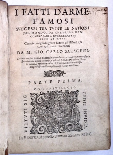 In -4°, cc. (80), 316, piena pelle con fregi ai piatti e al dorso. Il primo dei due volumi del Saraceni, pensatore e filosofo di origine bolognese o, secondo alcuni, veneziana. The first of two volumes of Saraceni, a philosopher of uncertain birth (Venice or Bologna).