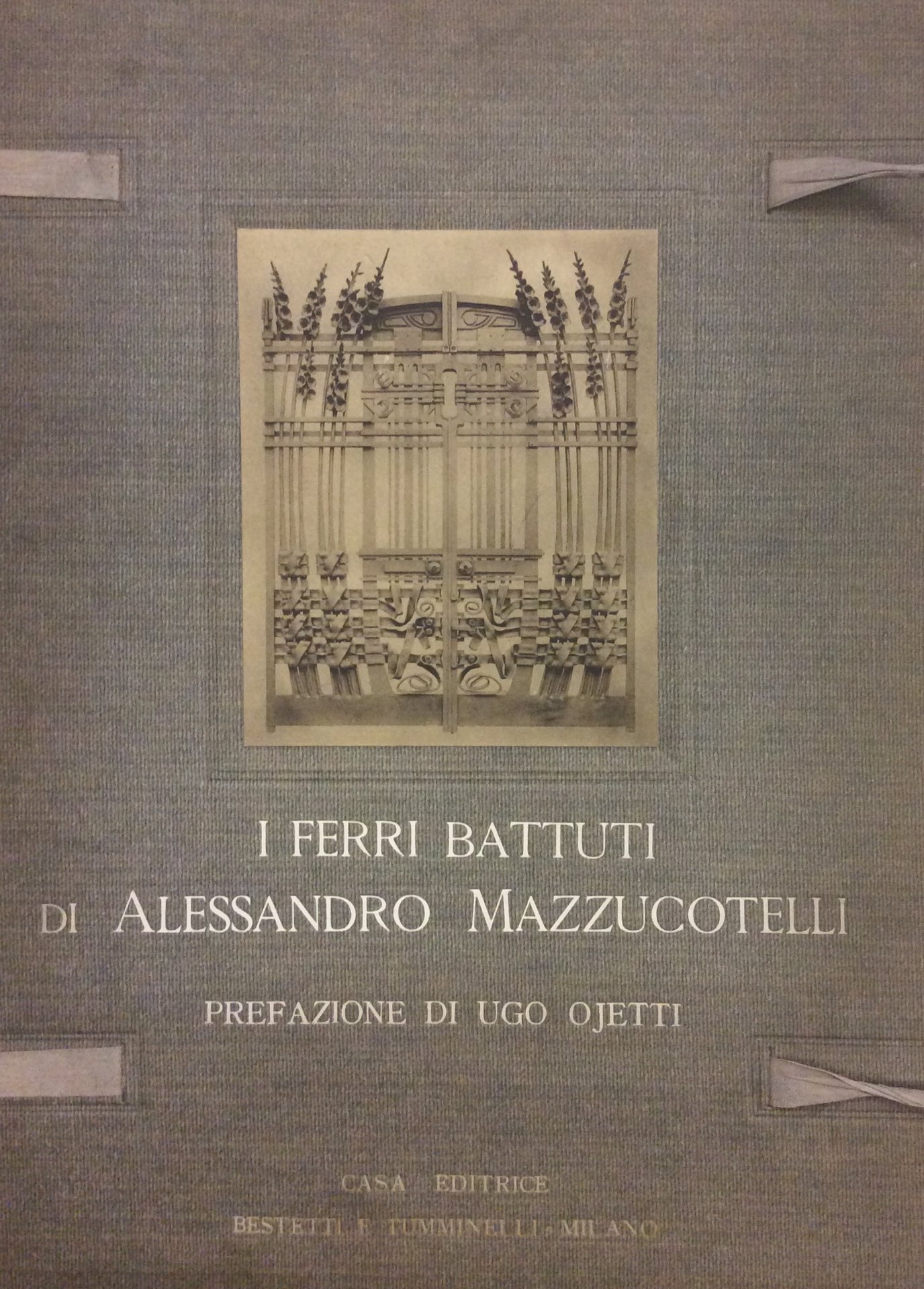 In folio, cartella editoriale in tela con legacci e fotografia in bianco e nero applicata al piatto anteriore, contenente a fogli sciolti: 4 pp. di prefazione, 1 ritratto e 50 tavole fotografiche in bianco e nero che illustrano l'importante opera dell'artista lodigiano, realizzata in Italia e in Messico. Alessandro Mazzucotelli (18651938), artigiano del ferro, è conosciuto soprattutto per i ferri battuti in stile Liberty che arricchiscono gli edifici di molti importanti architetti del primo Novecento.Ben conservato..