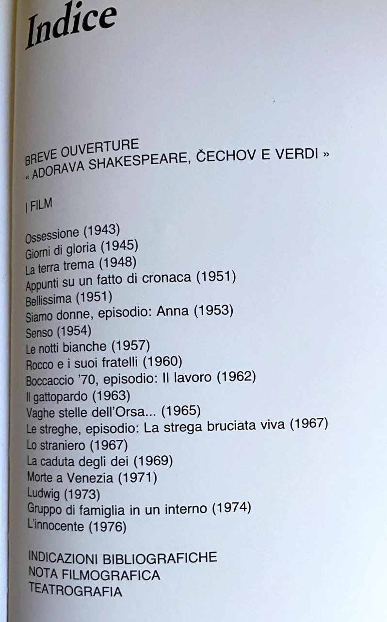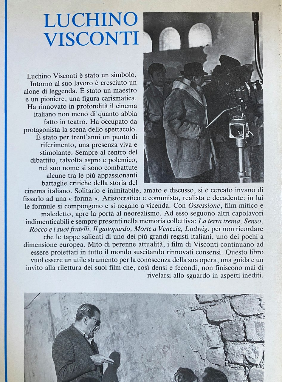 Soggetti: Cinema Filmografia Bibliografia Riferimento Libri rari illustrati Vintage fuori catalogo Registi italiani Movies Cult Regia Attori Attrici Divi Dive Anni Sessanta Settanta Ottanta Italiano Società Scenografia Shakespeare Cechov Verdi Ossessione Giorni di gloria La terra trema Appunti su un fatto di cronaca Bellissima Siamo donne Senso Le notti bianche Rocco e i suoi fratelli Boccaccio '70 episodio II lavoro Il gattopardo Vaghe stelle dell'Orsa Le streghe La strega bruciata viva Lo straniero La caduta degli dei Morte a Venezia Ludwig Gruppo di famiglia in un interno L'innocente Aiuto regista Alain Delon Aschenbach Bragana Carlo Critica Cinematografica Recensioni Ciro Commento Musica Conflitto Coscienza Dialoghi Dimensione Direttore Fotografia Donna Dramma Enrico Medioli Franco Mannino Franz Gino Giovanna Giuliana Helmut Berger Ideologica Interpreti Personaggi Luce Macchina da presa Madre Anna Magnani Marcello Mastroianni Mario Garbuglia Serandrei Massimo Girotti Melodramma Scena Meursault Montaggio Nadia Narrativa Neorealismo Novecento Ntoni Paolo Stoppa Passione Piero Tosi Proiezione Protagonista Racconto Realista Rina Morelli Romanzo Romy Schneider Scene Costumi Sceneggiatura Premio Oscar Scenografo Schermo Sequenza Sguardo Silvana Mangano Simbolico Simone Sogno Storia Suso Cecchi d'Amico Tadzio Tancredi Teatrale Teatro Thomas Mann Tragedia Tullio Valastro Verga Viscontiana Zavattini Lino Miccichè Gianni Rondolino Caterina De Carvalho Claretta Tonetti Pio Baldelli Yves Guillaume Veronica Pravadelli Mino Argentieri Allestimenti Lirica Maria Callas Camus Covent Garden Dostoevskij Episodi Ferdinando Scarfiotti Festival Flashback De Lullo Inquadrature Orchestra Mahler Miller Mostra Internazionale Sandra Spettacolo Stagioni Strehler Zeffirelli Alicata Ambienti Antifascismo Estetica Fascista Puccini Giuseppe De Santis Ingrao Intellettuali Interpretazione Jean Renoir Malavoglia Palcoscenico Politica Pubblico Via del tabacco Aci Trezza Alfried Ambiguity Angelica Annovazzi Arborio Brothers Characters Conversation Piece D'Annunzio Damned Death Don Calogero Donnafugata Episode Essembecks Expression Fabrizio Salina Father Feelings Innocent Interview Konrad Reviews Critics Successes Filmography Bibliography References Collectibles Illustred out of print Books Italians Sicily Sicilia Lampedusa Leopard Lietta Lives Livia Lodger Lover Bologna Maddalena Marxist Milan Mother Murder Natalia Nazi Novel Passion Political Prince Rome Screenplay Sedara Sexual Sicilian Sophie Stranger Theater Theme Valastros White Nights Woman Premiere Young Schede Cast Credits Sinossi Cineteca Restauro Lino Miccichè
