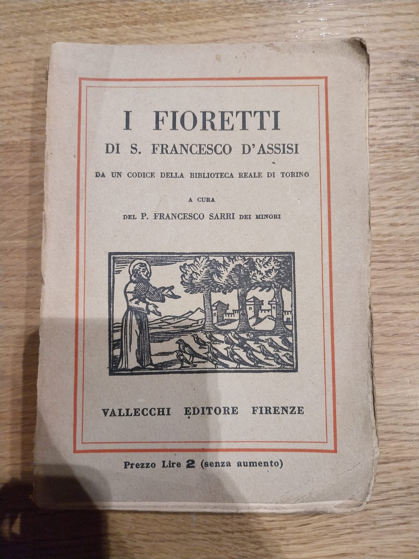Raccolta di aneddoti di San Francescio d'Assisi in condizioni pessime (copertina rotta e libro diviso a metà).