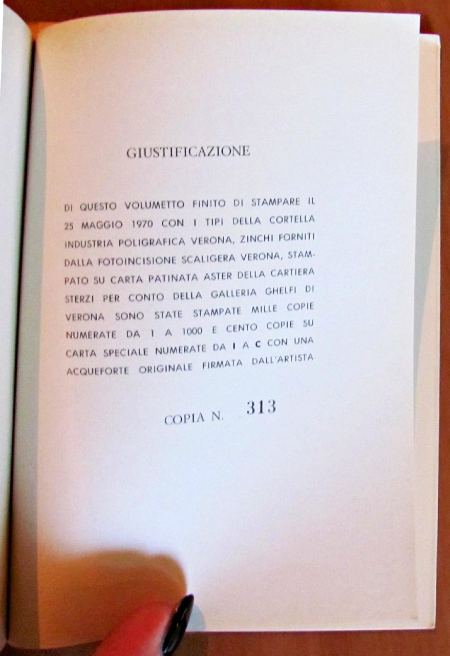 19 illustrazioni in b/n e 10 a colori, tutte a piena pagina ante-retro. Ed. Ghelfi - Verona, 1970. Brossura editoriale illustrata a colori con titoli al piatto e al dorso. Tiratura limitata a 1000 esemplari numerati, nostro N.313. 11x15; pp.47. BUONISSIMO STATO , Molto buono (Very Good)