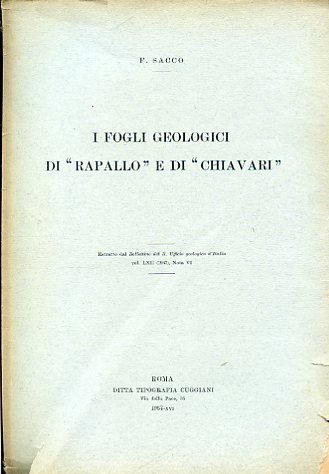 In-8°, pp. 22, brossura editoriale. Due tavv. in b.n. ripiegate tra le pp. 16-17 con riproduzione di 12 figure. In fine, ripiegate, una tav. in b.n. con due schemi di sezioni geologiche e una carta in litografia a colori delle stratificazioni geologiche del territorio di Rapallo e di Chiavari. Bell'esemplare. Firma autografa del Sacco al piatto.