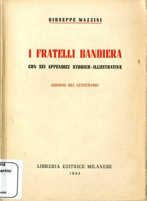 161 p. : ill. ; 20 x 14 cm. Questo testo di Mazzini venne edito poco dopo la tragica e sfortunata spedizione mazziniana dei fratelli Bandiera in Calabria, la prefazione alla prima edizione porta infatti la data dell'ottobre 1844, tre mesi dopo la morte degli eroici patrioti nel Vallone di Rovito. Brossura editoriale, coperta in cartoncino flessibile con titolo impresso in rosso al piatto e al dorso. All'interno varie illustrazioni in b/n. È conservata la fascetta pubblicitaria del libro in carta rossa. Carta leggermente ingiallita, firma di appartenenza nell'occhietto, per il resto esemplare integro. Codice libreria 8651.