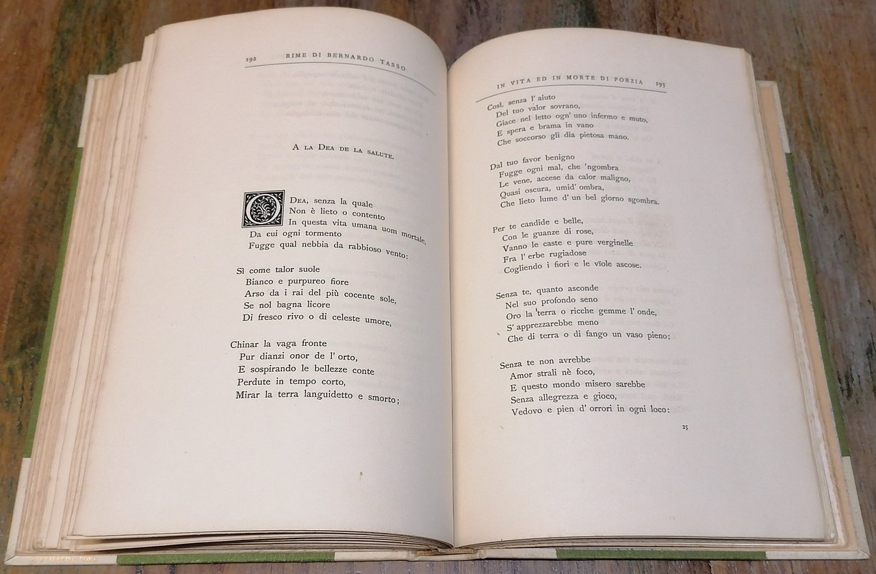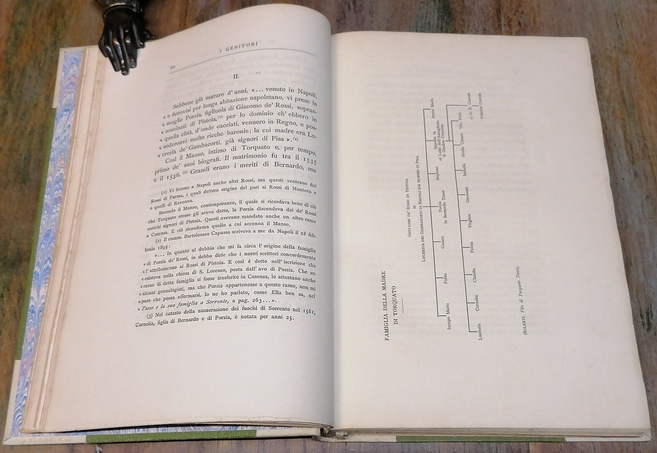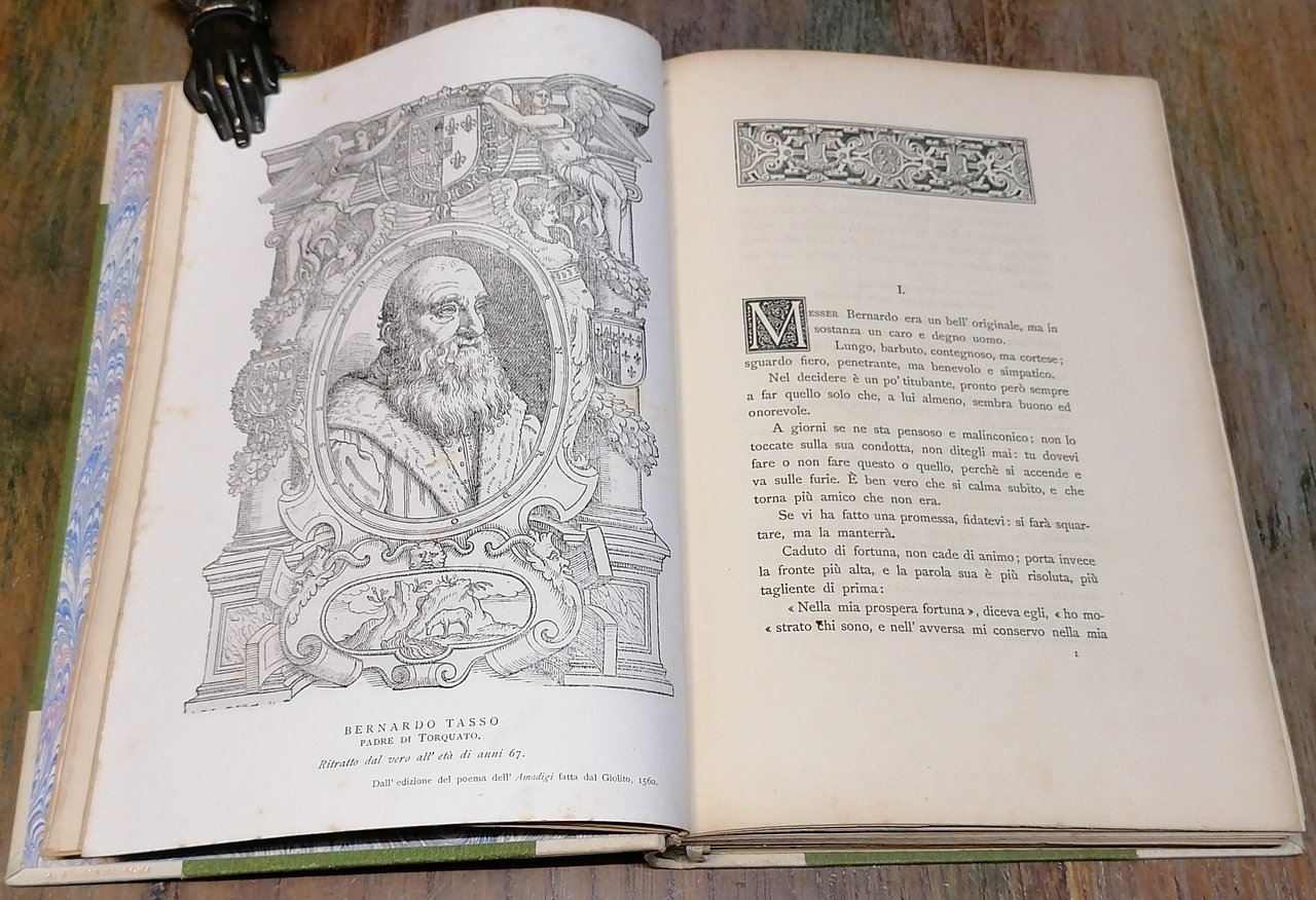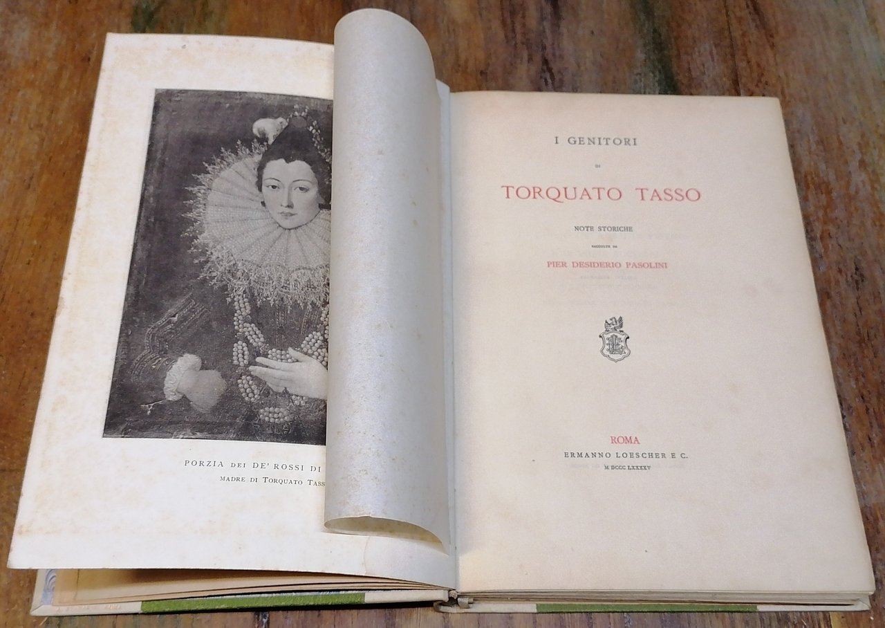 (Biografie; Epistolari; Porzia de' Rossi; Bernardo Tasso) In 8° (cm 26 x 18), legatura coeva in mezza pergamena con punte, titoli impressi in oro al dorso, guardie in carta marmorizzata, pp. XI,(1),289,(3), con 6 tavole fuori testo : Ritratto di Porzia de' Rossi - Ritratto di Bernardo Tasso - Albero della famiglia della madre di Torquato - Riproduzione di una lettera di Bernardo - Riproduzione di un sonetto inedito di Bernardo - Riproduzione di una lettera firmata da Porzia de' Rossi alla signora cavaliera Pace Gromella. Edizione di seicento esemplari pubblicata in occasione del terzo centenario dalla morte di Torquato Tasso. Volume solido e ben conservato.