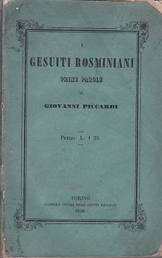 In-8°, pp. 91, brossura editoriale verde con titolo entro bordure di filetti con fregi accantonati. Restauri al dorso. Buon esemplare. Unica edizione, non comune, di questo pamphlet antirosminiano (il filosofo di Rovereto è preso di mira soprattutto per le assai scomode 'Cinque Piaghe della Santa Chiesa'). L'autore si propone di dimostrare che i 'i Rosminiani sono Gesuiti peggiori dei Lojolesi'.