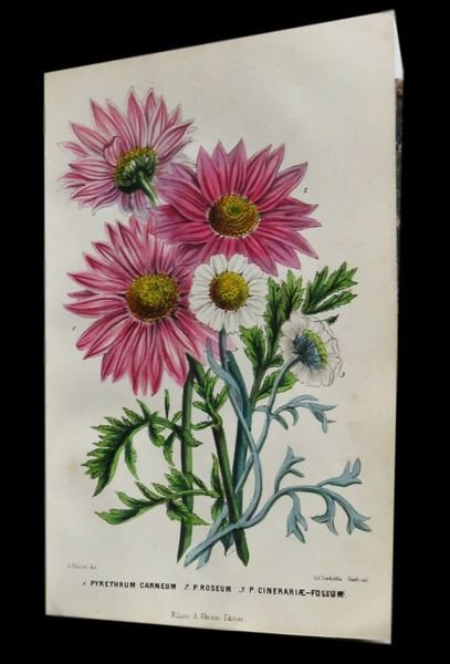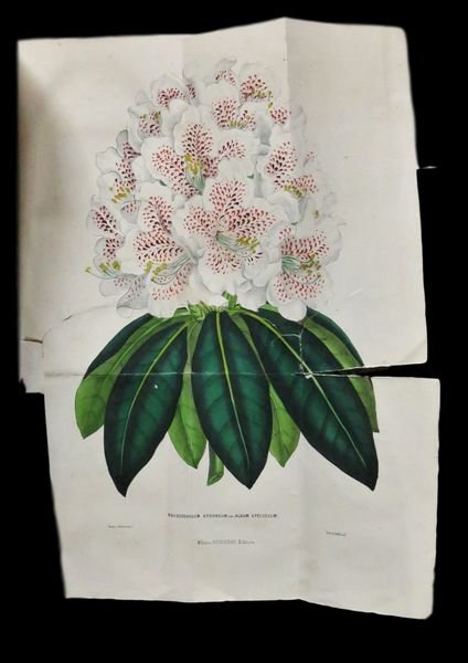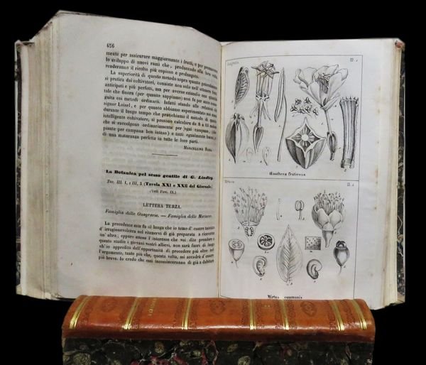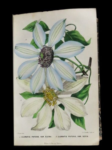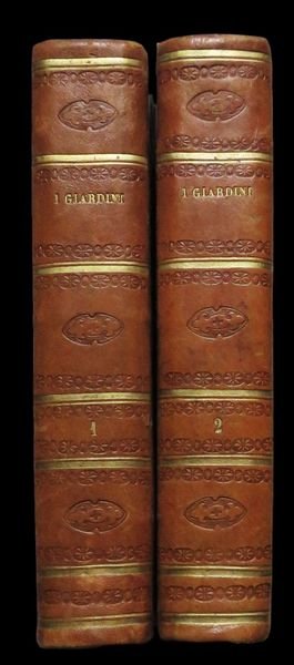 In 8° (21x13,3 cm); due tomi: 576 pp. 20 c. di tav. fuori testo delle quali 13 bellissime tavole con coloritura coeva con immagini di fiori (la tavola più volte ripiegata del Rhododendrum arboreum presenta uno strappo senza perdita di carta); 575, (1) pp. 31 c. di tav. fuori testo delle quali 18 bellissime tavole con coloritura coeva con immagini di fiori. Belle legature coeve in mezza pelle chiara con titolo e ricchi fregi in oro e a secco al dorso. Piatti foderati con carta marmorizzata coeva. Le tavole come in tutte le copie conosciute risultano collocate in modo diverso rispetto alla legenda. Alcune tavole in legenda sono assenti mentre se ne trovano altre in più rispetto alla stessa. Nel nostro secondo volume, ad esempio, dovrebbero esserci 26 tavole invece che 30. In genere però tutti gli esemplari presentano un numero di tavole uguali ai due volumi qui presentati. Prima edizione della prima edella seconda annata di questa celeberrima opera di botanica, giardinaggio ed architettura dei giardini con articoli di notevole importanza ed interesse vario come: Il tulipano, Wellingtonia Gigantea, Sopra alcuni Nasturzi, Il cipresso piangente della China, Coltivazione dei Crisantemi della China, Delle Clematiti indigene e di alcune esotiche per fare pergolati e per tapezzare le muraglie dei giardini, Un cenno ed alcune notizie sui Ciclami esposizione del modo pratico di coltivarli, Gladiolo Ramoso, Dell'Hoya Variegata e sua coltivazione, La Camellia, Della Fioritura Invernale, Cenni di alcune piante che più o meno soffrirono i geli del verno 1853-1854, Dell'arte di comporre e decorare i gairdini, Propagazione delle Rose per barbatelle radicali, Modo di aver per innesto diversi colori sulla stessa pianta della Regina Margherita del signor Tollet, Distinzione delle terre di Brughiera, Delle Serre, Il rabarbaro introdotto nell'economia domestica sua coltivazione e modo di prepararlo, L'Albicocco, Coltivazione forzata ed ordinaria dei meloni, Dioscorea Japonica, Solanum Ventrucosum succedaneo al Pomo di Terre, Della moltiplicazione degli arbusti per talee poste nell'acqua, Morfologia vegetale, Alcune parole sulla germogliazione, Rivista di piante nuove, Notizie di giardini antichi e moderni, Introduzione alla Fuchsia, Dei colori dei fiori, Dell'Humus, Nuovo mezzo per guarire le viti della crittogama, Ulteriori proposte contro il male dell'uva e sopra un liquore fermentato succedaneo al vino d'uva, Idee degli antichi sopra la genesi della Cannella e alcune considerazione sulla sua storia, Mezzo facile di rendere innocui i funghi velenosi, Esposizione dei fiori a Torino, Secondo esperimento di esposizione a Ferrara, Terza esposizione di piante tenuta dalla Società promotrice di giardinaggio, nell'orto botanico di Padova del giugno 1854, Una società di Orticoltura in Toscana, Fiera dei fiori per l'anno 1855 a Milano, Esposizione dei fiori a Modena ed a Firenze, Una rosa verde premiata all'esposizione di fiori a Manheim, Premj sulla malattia dell'Uva, Delle magnolie e più particolarmente di un bellissimo ibridismo ottenutosi dal sigor conte Giuseppe di Salvi Valmarana a Vicenza, Sopra la fioritura invernale, Le petunie, Gli Amorini, Un'escursione di Botanica e metodo per agevolare lo studio pratico delle piante, Alcune cautele igieniche per le Serre, Delle Grottte artificiali, Dei tulipani, Gladiolus tristis, Della fruttificazione dell'Hoya carnosa, Del Gynerium argentum , Coltivazione dei Giacinti entro il musco, Rosa Verde, Modo di riordinare a florida vegetazione piante distaccate o prossime a perire , Osservazioni generali sul modo di alleviare gli alberi fruttiferi, Della coltivazione forzata dei meloni nei cassoni, Il fico, Nuova specie di Pisello, Del Nespolo, Pero Angelico, Piante nuove rare o curiose, Dell'Agave, Giardino di alberi esotici a Hohenheim in Baviera, Varietà di Pepe lungo, Il fagiuolo velenoso della vecchia Calabria, Dell'uso del succo procedente dallo schiacciamento dell'uva immatura, Singolare modo di coltura praticato dai chinesi, Prima Esposizione di fiori a Milano, Esposizione floreale in Torino, Serre acquatiche animate e coltivate, ecc. ecc. Prima edizione in buone-ottime condizioni di conservazione.