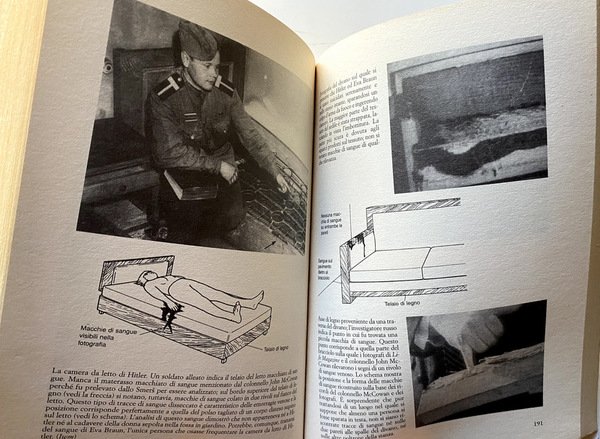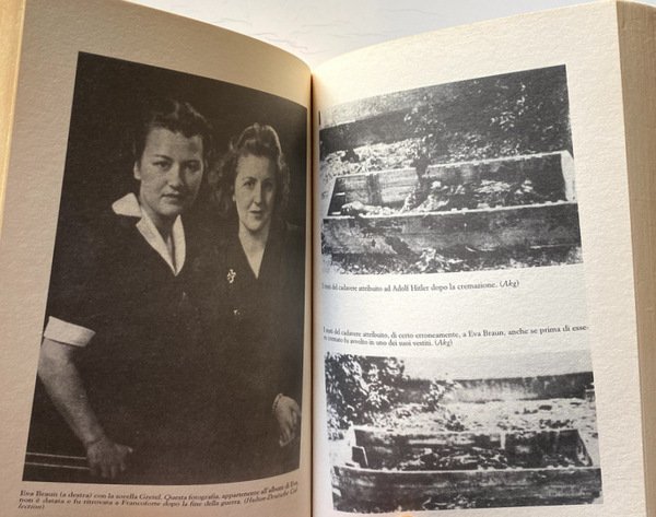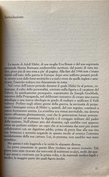Soggetti: Storia contemporanea, Germania nazista, Olocausto, Nazismo, Novecento, Ebrei, Ebraismo, Shoah, Seconda Guerra Mondiale, Adolf Hitler, Biografie, Fine, Terzo Reich, Sconfitta, Bunker, Morte, Suicidio, Eva Braun, Corpo, Funerali, Sepoltura, Ricostruzione, Reportage, Verità, Cadaveri, Corpi, Salme, Ritrovamento, Perizia medico-legale, Avvelenamento, Cianuro, Frode, Fuga, Intrighi, Depistaggi, Piste, Sud America, Argentina, Paraguay, Pista paraguayana, Mappa, Piantina, Documenti, Joseph Goebbels, Mito, Segreti, Servizi, SS, Pastore tedesco, Libri illustrati, Fotografie d'epoca, Libri Vintage Fuori catalogo, Saggi storici, Politica, Ideologie politiche, Fascismo, Fonti, Inchieste, Processo di Norimberga, Rudolf Hess, Stalin, Russia, Unione Sovietica, Esercito, Resa, The Murder of Adolf Hitler, Götterdämmerung, Alleati, Americani, Testimoni, Zukov, Mosca, Leningrado, Croce di ferro, Simboli, Cancelleria, Sangue, Divano, Fotografi, John McCowan, Smers, Camera da letto, Stanze, Ritrovamenti, Fossa, Giardino, Vestiti, Cremazione, Collettivo Kukrynski, Soluzione finale, Letteratura, Bibliografia, Riferimento, Martin Bormann, Archivi sovietici, Cervello, Mente, Capsule, Ferite, Incendio, Resti carbonizzati, Stumpfegger, Camera delle carte geografiche, Kathe Heusermann, Dentista, Assistente, Testimoni, Ministri, Esteri, Armamenti, Albert Speer, Lester Luntz, Segretario personale, Ossa, Denti, Cranio, Contemporary history, Nazi Germany, Holocaust, Twentieth century, Jews, Judaism, Second World War, Biographies, End, Third Reich, Defeat, Death, Suicide, Body, Funeral, Burial, Reconstruction, Truth, Corpses, Bodies, Corpses, Finding, Forensic expertise, Poisoning, Cyanide, Fraud, Escape, Intrigue, Misdirection, Tracks, South America, Paraguayan track, Map, Floor plan, Documents, Myth, Secrets, Services, German shepherd, Picture books, Vintage photographs, Books Out of print, Historical essays, Politics, Political Ideologies, Fascism, Sources, Investigations, Nuremberg Trials, Soviet Union, Army, Surrender, Allies, Americans, Witnesses, Moscow, Iron cross, Symbols, Stationery, Blood, Sofa, Photographers, Bedroom, Rooms, Finds, Pit, Garden, Clothes, Cremation, Collective, Final solution, Literature, Bibliography, Reference, Soviet archives, Brain, Mind, Capsules, Wounds, Fire, Charred remains, Maps, Dentist, Assistant, Witnesses, Ministers, Foreign Affairs, Armaments, Personal Secretary, Bones, Teeth