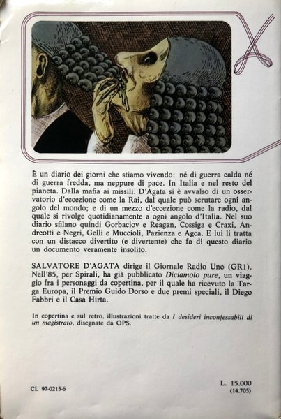 È un diario dei giorni che stiamo vivendo: né di guerra calda né di guerra fredda, ma neppure di pace. In Italia e nel resto del pianeta. Dalla mafia ai missili. D'Agata si è avvalso di un osservatorio d'eccezione come la RAI, dal quale può scrutare ogni angolo del mondo; e di un mezzo d'eccezione come la radio, dal quale si rivolge quotidianamente a ogni angolo d'Italia. Nel suo diario sfilano quindi Gorbaciov e Reagan, Cossiga e Craxi, Andreotti e Negri, Gelli e Muccioli, Pazienza e Agca. E lui li tratta con un distacco divertito (e divertente) che fa di questo diario un documento veramente insolito.