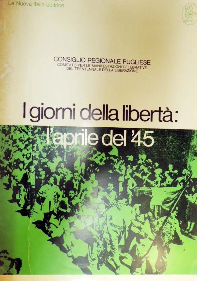I giorni della libertà: l’aprile del ’45. Scheda storica di Carlo Francovich e Leone Di Benedetto. Ricerca e scelta dei documenti di Fabio Fabbri, La Nuova Italia Editrice, Firenze 1975, quarta rist. Cartellina cm 44x31 contenente 22 tavole in formato 43x30 (21 con riproduzioni di frontespizi di quotidiani e locandine relativi alla Resistenza e 1 con elenco dei decorati pugliesi nella guerra di liberazione) e un fascicolo illustrativo di pp. 8. Collana Le fonti della storia, n. 11. In alto, sulla cartellina: Consiglio Regionale Pugliese – Comitato per le manifestazioni celebrative del trentennale della liberazione. Ristampa fatta realizzare dal Consiglio Regionale Pugliese, che donò copia della pubblicazione a Comuni, Province, istituti scolastici e biblioteche presenti sul territorio regionale, a fine commemorativo. All’interno, fotocopia di lettera di invio su carta intestata del Consiglio Regionale Pugliese, firmata dal Presidente dell’Esecutivo. Cartellina con copertina quasi interamente staccata, ma interno in perfetto stato di conservazione.