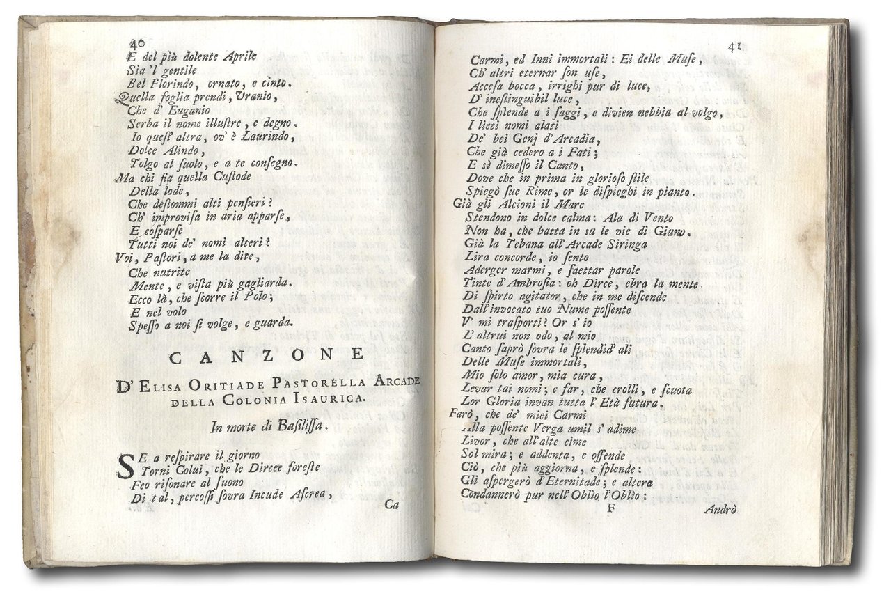 >in-8, pp. 127, legatura coeva piena pergamena, titolo manoscritto al dorso. Con grande emblema di Arcadia inciso sul titolo, finaletti silografati. Dedica a Carlo Albani, nipote di Clemente XI. Interessante volume che descrive la fastosa cerimonia tenutasi nel giardino del Principe Giustiniani con innalzamento di lapidi in onore di celebri arcadi defunti (Fr. Redi, M. Malpighi, C.M. Maggi, V. Viviani, L. Bellini, B. Menzini ed altri), con recite di componimenti poetici a celebrazione dei giochi, quali l'oracolo (interpretazione della risposta di Apollo Pitio), le contese (comporre nuove e bizzarre canzoni), le trasformazioni (gara a trasformarsi in qualcosa tramite un sonetto), le ghirlande (madrigali per tessere le lodi di qualcuno). Interessanti in fine l'elenco delle 19 colonie arcadi e quello dei "pastori arcadi" coi relativi nomi reali. Curioso e raro libro.