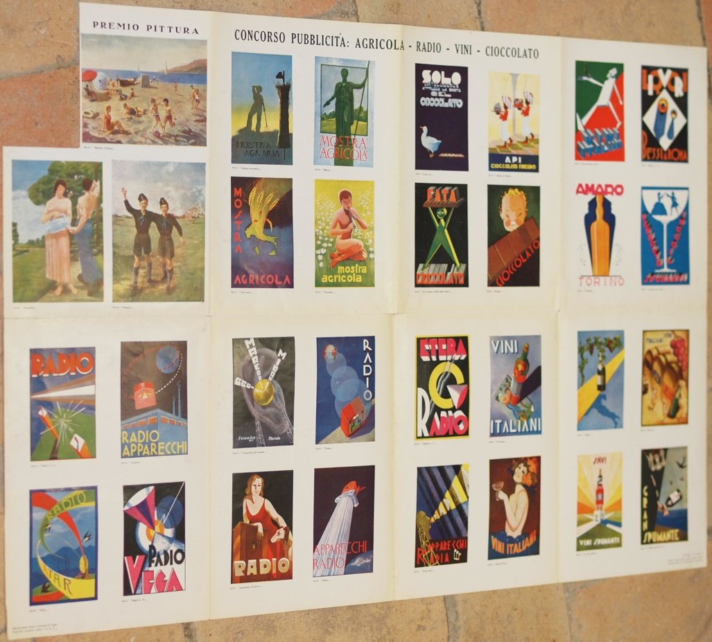 In folio. Dim. 54,5x86 cm. Bellissimo poster del 1932 "I grandi concorsi A.B.C." che riproduce le varie opere candidate ai concorsi indetti dalla rivista nelle categorie Leonardo da Vinci, Pubblicità, artigianato, Umorismo. Presenti 47 riproduzioni di pubblicità. Una riproduzione risulta mancante, è stata tagliata dal poster. Piegature. In buone condizioni. Very beautiful poster of 1932 "I grandi concorsi A.B.C." reproducing the different works participating to concourses irganized by the magazine in the categories Leonardo da Vinci, Pubblicità, artigianato, Umorismo. There are 47 reproductions of advertisings. A reproduction is missing, it has been cut from the poster. Foldings. In good conditions.