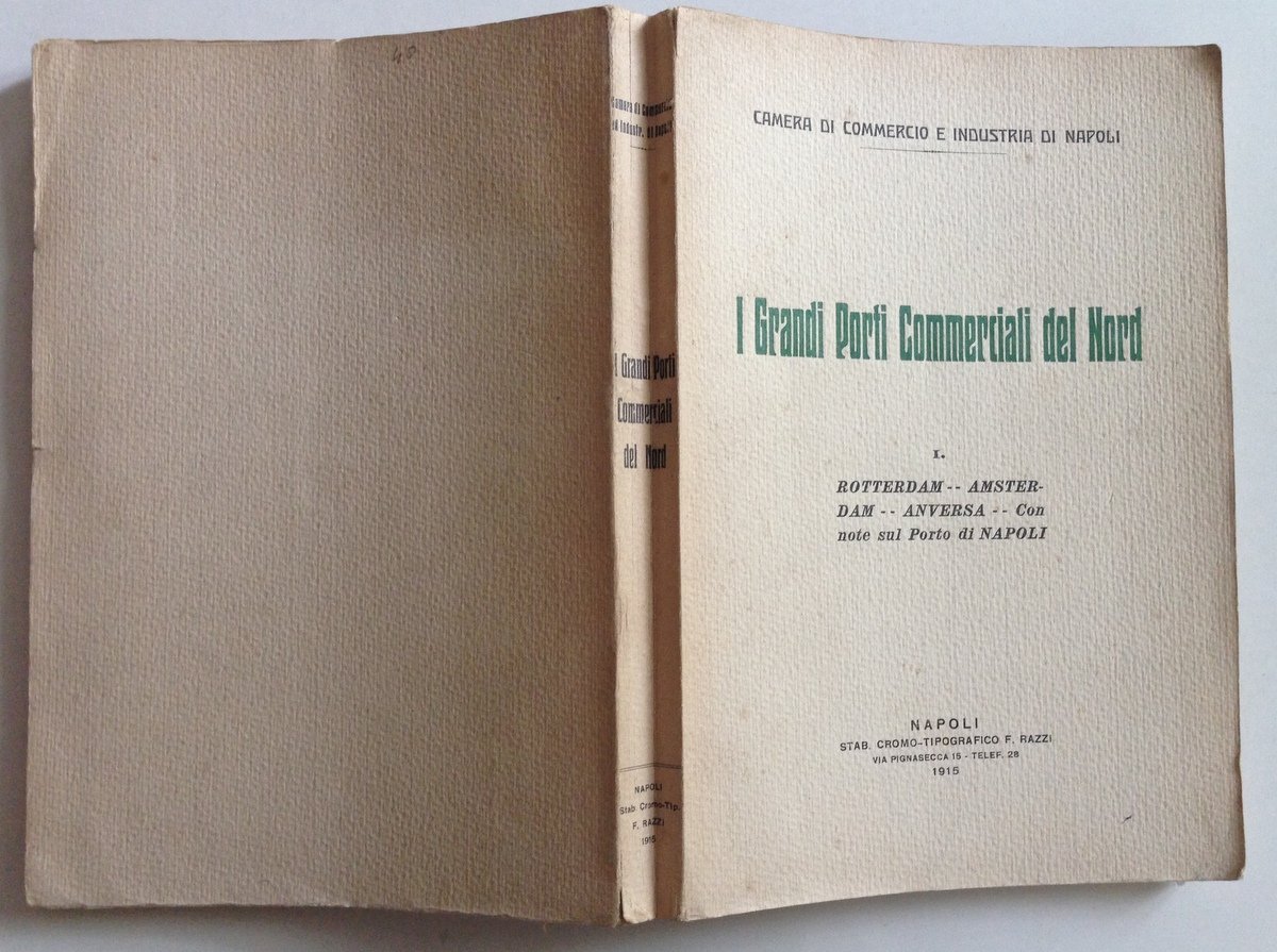 CAMERA DI COMMERCIO NAPOLI, I GRANDI PORTI DEL NORD ROTTERDAM, AMSTERDAM, ANVERSA CON NOTE SUL PORTO DI NAPOLI NAPOLI, RAZZI, 1915, in 8°, pp. 198 con tavv. rip. f.t., br. ed. Condizioni di conservazione Esemplare in buono stato con leggere tracce d'uso, brossura editoriale con qualche brunitura, minimo strappetto alla cerniera superiore, lieve traccia di piega al margine inferiore del piatto anteriore, interni buoni. MM0539/C2-50