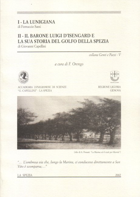 In-8°, pp. 121, (3), copertina editoriale illustrata. Con alcune illustrazioni in bianco e nero nel testo. Stato di nuovo. Volume V nella collana "Genti e Paesi". Indice: Presentazione; I. Ferrucccio Sassi, La Lunigiana; II. Giovanni Capellini, Il barone Luigi d'Isengard e la sua Storia del Golfo della Spezia.