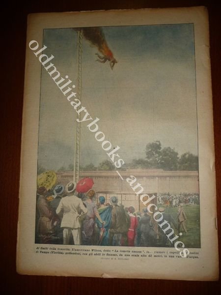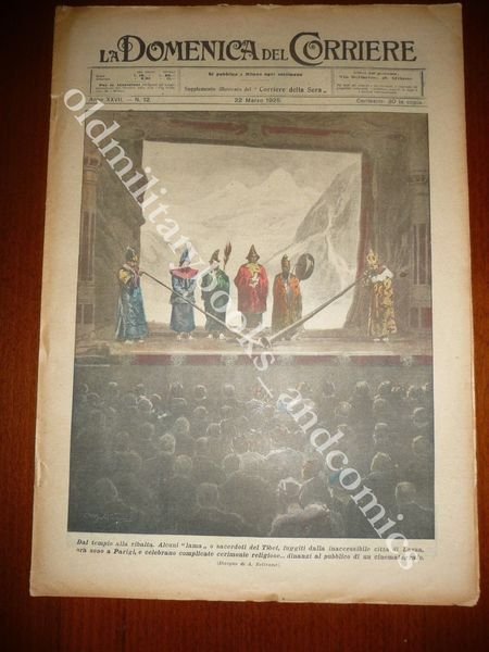 DESCRIZIONE: LA DOMENICA DEL CORRIERE 22 marzo 1925 n. 12 In copertina: Alcuni sacerdoti Lama del Tibet fuggiti da Lassa si esibiscono a Parigi. Al retro: L'americano Wilson detto "La cometa umana" si getta da 42 metri, con gli abiti in fiamme, in una vasca d'acqua. CONDIZIONI DELL'OGGETTO: Ottime senza sovracc. azzurrina. PESO/WEIGHT: 47 g without package