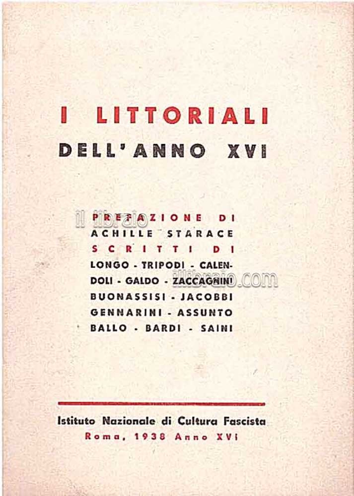 in 8°; pp. 40 + 6 tavv. (ill. in bn.); br. Prefazione di Achille Starace. Scritti di Longo, Tripodi, Calendoli, Galdo, Zaccagnini, Buonassisi, Jacobbi, Gennarini, Assunto, Ballo, Bardi e Saini