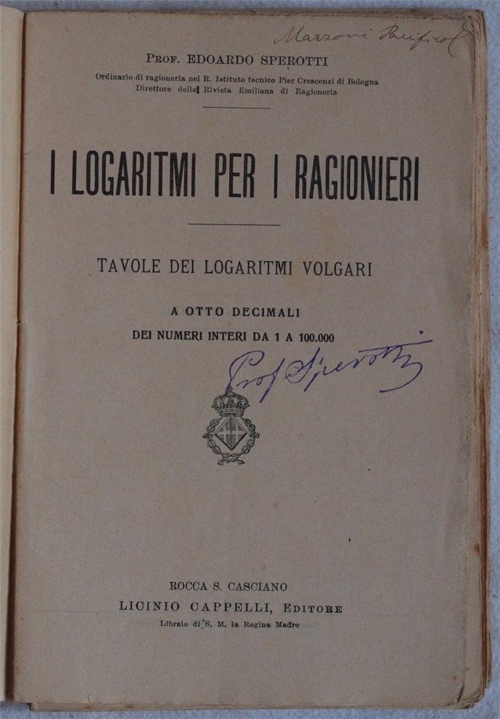 In 8. Dim. 19,5x13 cm. Pp. XVI+154+(2). Edizione del 1911 di questo manuale sui logaritmi per i ragionieri. All'inizio parte introduttiva sui logaritmi, seguono tavole. Al frontespizio firma d ell'autore e del vecchio proprietario. In discrete condizioni.Copertina editoriale in mediocri condizioni generali con usure e parti mancanti ai margini e dorso. Piatto anteriore assente. Legatura quasi assente. All'interno le pagine si presentano in buone condizioni con rare fioriture. Edition of 1911 of this manual about logarythms for administrators.<BR>At the beginning introductive part about logarythms, then planches. In the title page signature of the author and ex owner. In fair conditions. Editorial cover in poor general conditions with wearings and missing parts in the edges and spine. Front plate is missing. Binding is almost missing. Inside pages are in good conditions with occasional foxings.