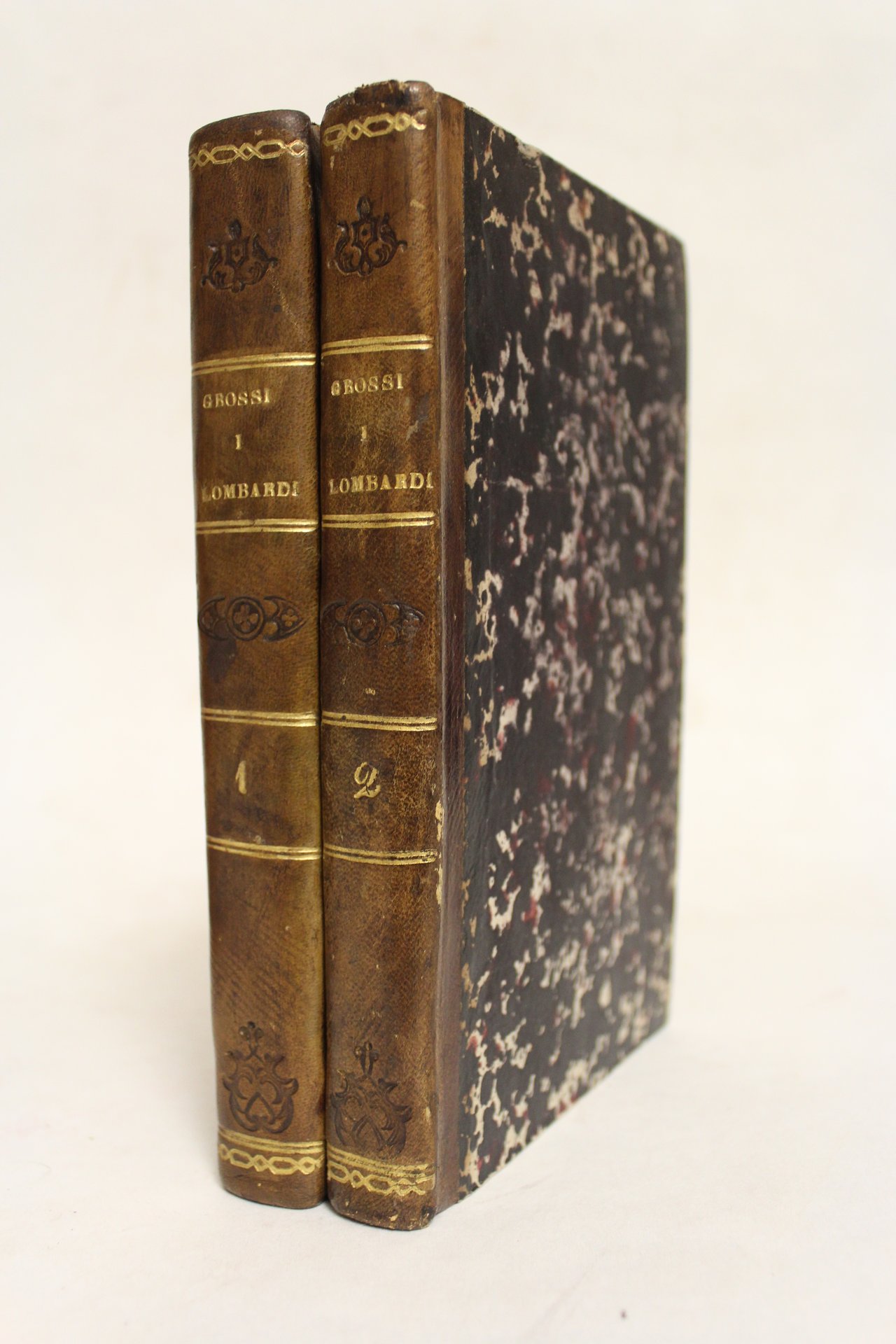 Due opere in due tomi. In 8°(mm 213x140); pagg. 152; 111, (1) con 4 tavole f.t. incise in rame.<BR>Mezza pelle di vitello nocciola con fregi a secco, autore e titolo in oro al dorso, scomparti e filetti dorati. Prima edizione di questo poema storico in 15 canti in ottave, tentativo di celebrazione epico-lirica della prima crociata, da cui Temistocle Solera derivera' il libretto per l'omonima opera lirica verdiana, rappresentata alla Scala nel 1843. Bell'esemplare, fioriture e qualche alone, timbro circolare di collezione privata a sguardie, pag. 13 del secondo fascicolo e 121 del terzo. <BR>