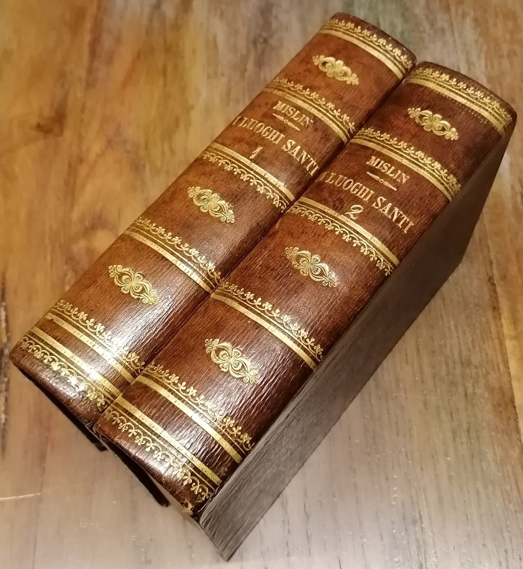 (Viaggi - Terra Santa - Europa Orientale - Medio Oriente - Palestina) Due volumi in 16° grande (cm 18 x 12,5), legatura coeva in mezza pelle, titoli, filetti e fregi impressi in oro al dorso, pp. 651,(1) ; 728, con due carte più volte ripiegate in fine (Piano di Gerusalemme - Piano della Chiesa del Santo Sepolcro). Leggeri punti di ossidazione ad alcuni fascicoli, peraltro volumi ben conservati, in solida legatura.