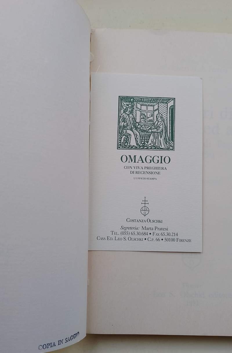 In 8', br. ed., pp. 295, lievi segni d'uso alla cop., macchia al margine interno del piatto ant., timbro saggio al contropiatto ant., pieghe agli angoli delle ultime pagine(foto), conservato biglietto di invio(foto), interno in buono stato, ordinari segni del tempo. ***Due to bureaucratic reasons, books dated over 70 years old cannot be immediately exported, please contact us before placing the order.***