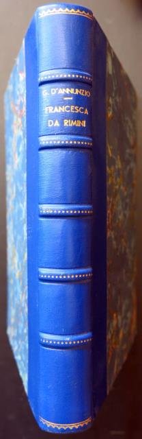 Fratelli Treves, Milano, 1916. dodicesimo migliaio. In 8vo largo, front. pp. X 279 + (1) conclusiva con testo elegantemente impaginato, solida ed elegante leg. con piatti in cartonato marmorizz. azzurro e dorso in pelle azzurra con titoli in oro (conservata sotto la bross. orig. figurata in nero illustrata da A. De Karolis), contropiatti e fogli di guardia in carta uguali alla copertina. La prima edizione della Francesca da Rimini è 1902. Ottimo lo stato di conservazione.