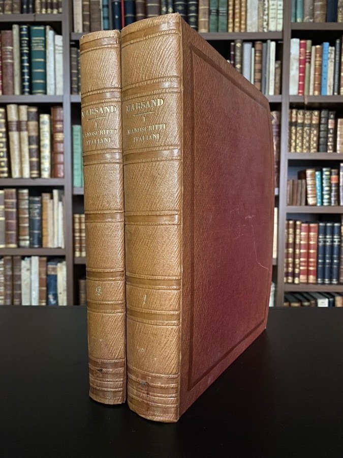 2 volumi in-4° (cm. 28), eleganti e genuine legature coeve in tutta tela con titoli in oro ai dorsi; pp. [4] XIII [3] 864 [4], [4] V [3] 514 [2] in buono stato, alcune fioriture. Edizione originale di questo importante catalogo ragionato dei codici italiani conservati nella Biblioteca Nazionale di Parigi, alla Bibliothèque de l'Arsenal, alla St.-Geneviève e alla Mazarine. Esemplare molto buono. (SH3)