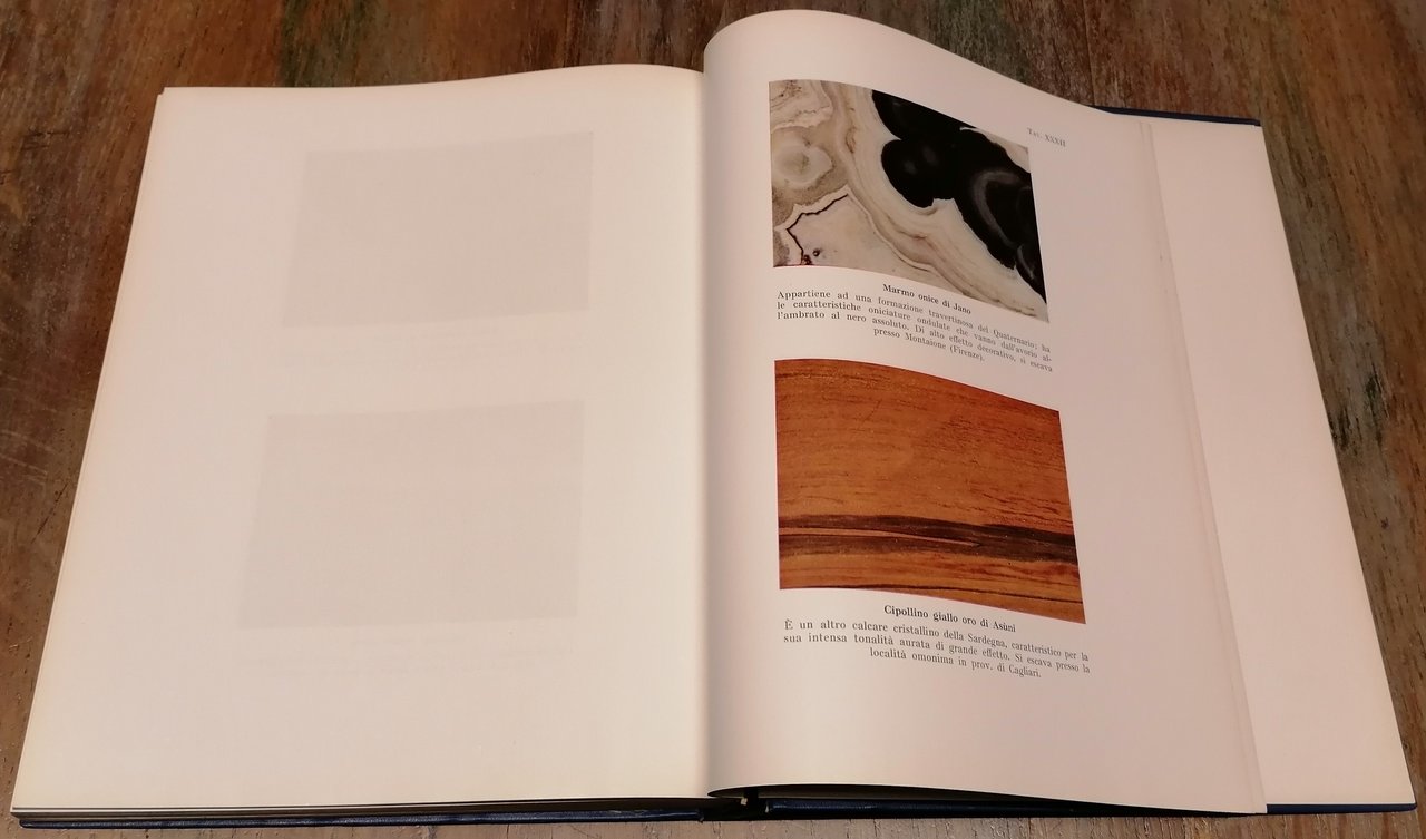 Mineralogia - Geologia - Tecnologia e merceologia dei marmi - Analisi chimica e microscopica di 110 esemplari - Le pigmentazioni coloranti nei marmi - La formazione di macchie deturpanti - I marmi antichi analizzati. Un volume in 4° (cm 27,5 x 22,5), legatura editoriale in piena similpelle blu con titoli impressi in oro al dorso ed al piatto anteriore, pp. XXIV,480,(2), con 113 illustrazioni in nero e 40 tavole fuori testo a colori. Con indice alfabetico dei marmi e delle ditte esercenti cave. Terza edizione ampliata con aggiornamenti tecnici riguardanti l'escavazione e le fasi di lavorazione del marmo, sono state aggiunte una trentina di fotografie e dodici riproduzioni a colori di nuovi marmi, aggiornato l'indice degli esercenti. Volume ben conservato, solo un lieve allentamento alla cerniera interna posteriore. Non è presente la sovraccoperta.
