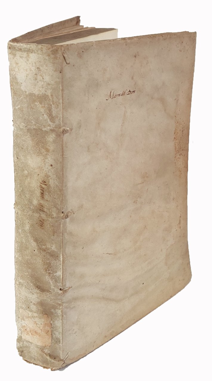Four parts in one volume, 4to (212x151 mm). 167, [1]; 119, [1]; 166, [2]; 93, [3] pp. Signatures: A-X4; Aa-Pp4; a4 B-X4; AA-MM4. Printer's devices on each title page and on the verso of the last leaf of every section. Printed with two different italic types. With 44 woodcut illustrations in the text, including the portraits of Doni, Marcolini, Gelli, and Petrarca; at p. 81 of the fourth part is reproduced the title page of another of Doni's works, the Inferni, of which is also announced the forthcoming publication and the contents described (this is probably the first case in the history of printing in which the imminent publication of a new work is promoted by reproducing within another published work its soon-to-be-released title page). Contemporary limp vellum, inked title on spine and front panel, gilt edges. On the front flyleaf verso shelf mark note “VII D-20”. A few leaves very slightly browned, some foxing to the gutter of a few leaves, final leaf repaired to gutter. A very good, extremely genuine copy.