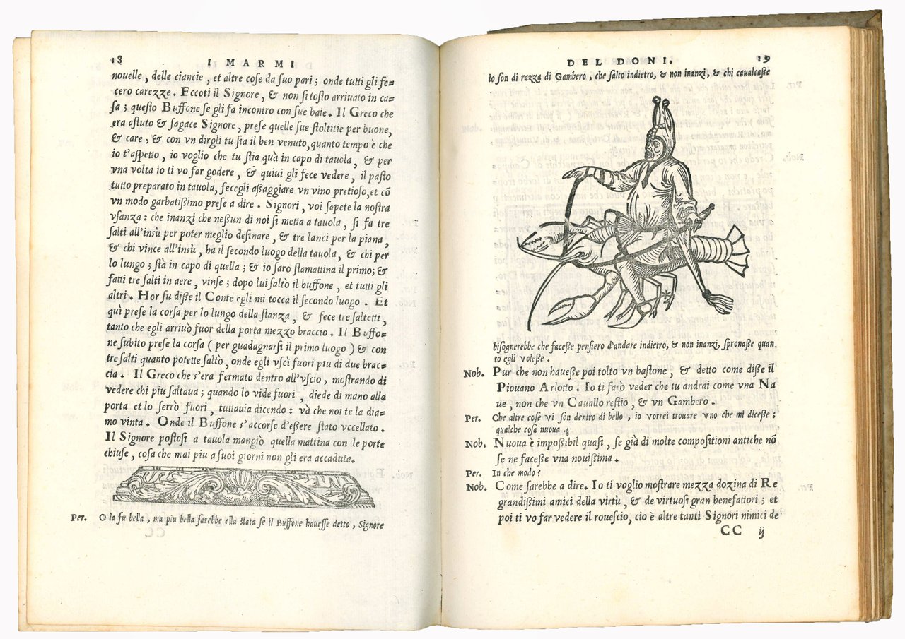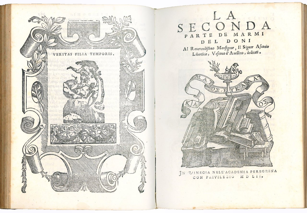 First edition of this collection of a great variety of texts consisting mostly of a series of imaginary dialogues involving over one hundred different characters, some real, some fictive, who are portrayed conversing on the marble steps (I marmi) of the Duomo of Florence on a wide range of unrelated topics. The many aspects (editorial, iconographic, musical, etc.) of the work are meticulously investigated by G. Rizzarelli (‘I Marmi' di Anton Francesco Doni: la storia, i generi e le arti, Florence, 2012, passim).