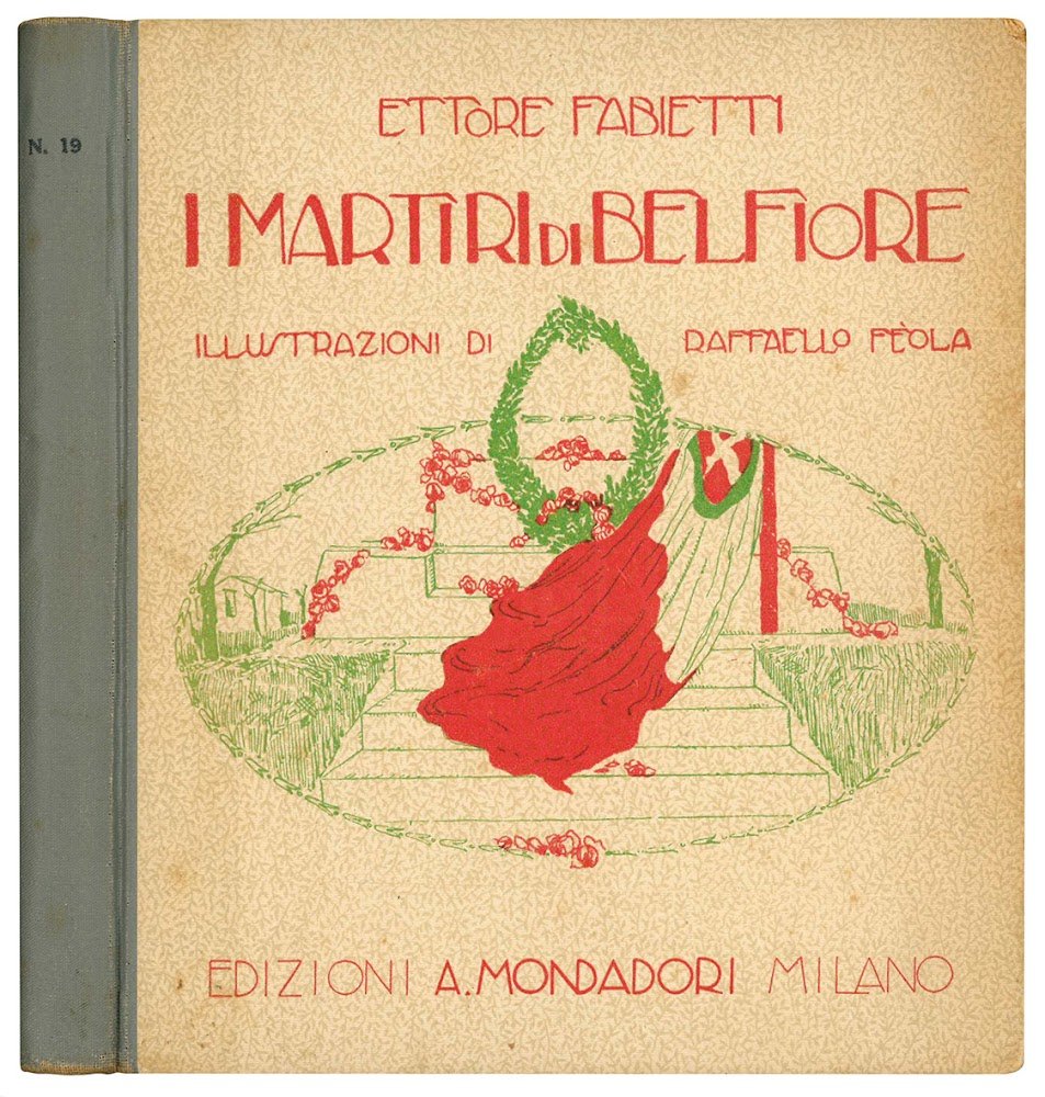 Mm. 179x157. Pp. pp. 105, [3], con tavole fotografiche in bianco e nero fuori testo ed illustrazioni anch'esse in bianco e nero fuori testo del Fèola. Testo entro filetto verde. Fioriture e lievi aloni diffusi. Mezza tela editoriale con illustrazione realizzata dal Fèola con i colori del Tricolore italiano al piatto anteriore. Narrazione per ragazzi della vicenda risorgimentale dei Martiri di Belfiore.