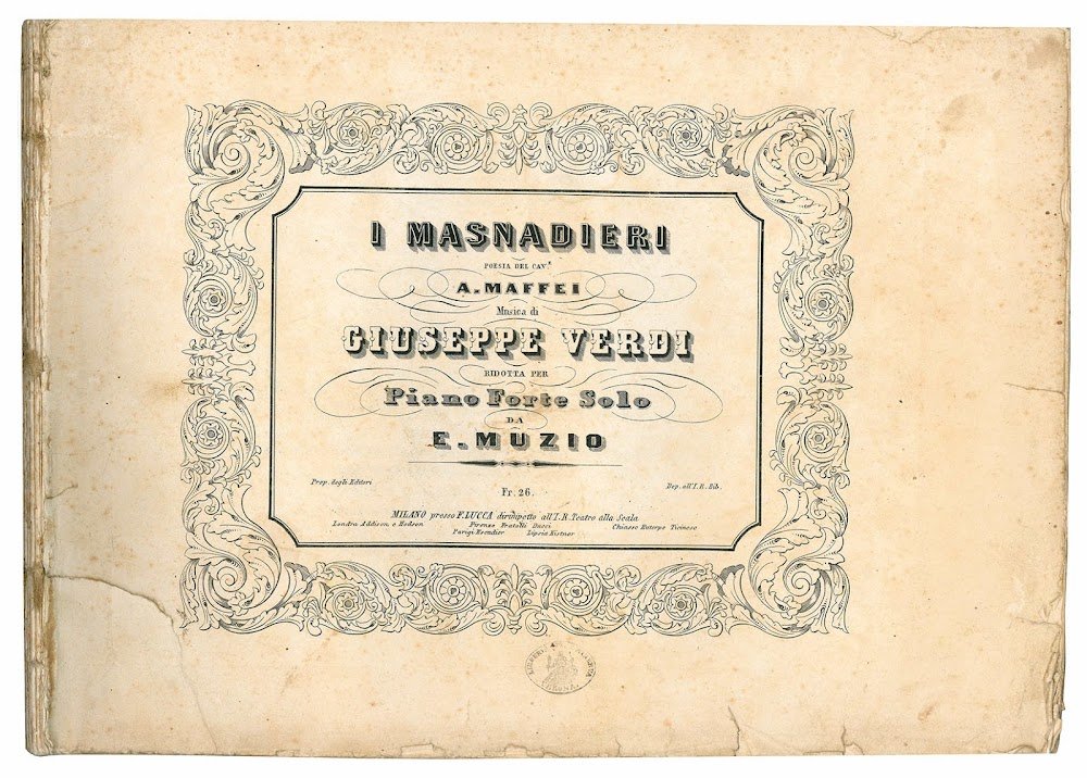 Mm. 360x263. Pp. 128. Spartiti musicali dell'opera "I masnadieri", poesia del Cav. A. Maffei, musica di Giuseppe Verdi, ridotta per Piano Forte Solo da E. Muzio. Il volume si compone di 19 brevi sezioni. Tutte le pagine sono impresse in rame. Lievi aloni e leggere fioriture ad alcune carte. Minime mancanze marginali e piccoli strappi alla prima carta.