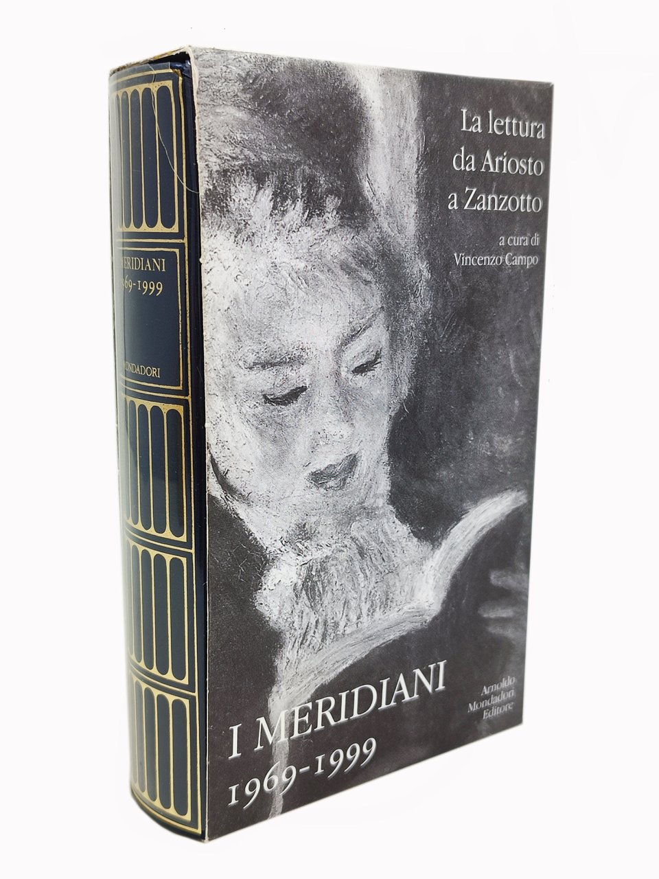 Prima edizione de I Meridiani (ottobre 1999). Dimensioni: 11 x 18 cm circa. Pagine: XXVII + 377. Stato di conservazione: uno strappetto (senza mancanza) sul margine superiore del dorso della sovraccoperta in acetato ma, nel complesso, un ottimo esemplare. Privo di scritte, sottolineature o altri segni nel testo. Si tratta di un catalogo di tutti i volumi pubblicati nella collana 'I Meridiani'. Numerose illustrazioni nel testo, riproducenti le varie copertine. Brossura editoriale con copertina cartonata rigida in pelle blu scuro con decorazioni e titoli in oro sul dorso. Sovraccoperta in acetato. Cofanetto editoriale in cartoncino morbido, illustrato su entrambi i lati.