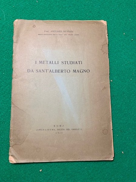 In 4°; 27, (1) pp. Brossura editoriale, qualche segno del tempo, uno strappetto al margine esterno bianco di una decina di pagine, senza perdita di carta. Raro scritto del celebre studioso di zoologia, mineralogia e botanica, Antonio Neviani (1857-1946), dedicato agli studi sui metalli di Sant'Alberto Magno.