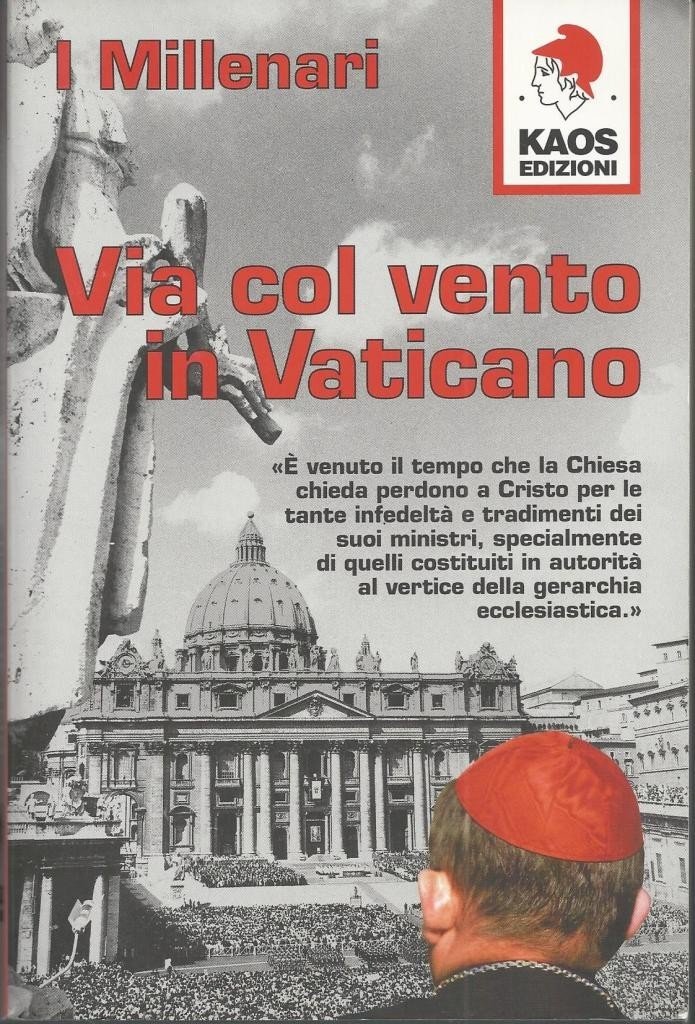 I Millenari, Via col vento in Vaticano, Kaos Edizioni, Milano 1999, prima ed., cm 21, br. ed. Pamphlet a carattere religioso scritto da un gruppo di prelati del Vaticano che hanno deciso di firmarsi con il nome di I Millenari. Sulla prima di copertina: È venuto il tempo che la Chiesa chieda il perdono a Cristo per le tante infedeltà e tradimenti dei suoi ministri, specialmente di quelli costituiti in autorità al vertice della gerarchia ecclesiastica. Lievissime tracce d’uso, per il resto perfetto.