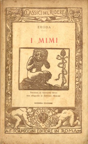 2. rist. VIII, 122 è. : ill. ; 22 x 13 cm. Classici del ridere. Sulla vita di Eroda abbiamo ben poche notizie, a partire dal nome attestato nelle tre forme di Eroda (Ἡρώδας), Erode (Ἡρώδης) ed Eronda (Ἡρώνδας). Probabilmente nacque ad Alessandria e fu attivo soprattutto nell'isola di Kos (dove è ambientato il secondo mimiambo - riferimento al tribunale della città isolana -, forse anche il primo e molto probabilmente il quarto). Si suppone che ebbe contatti con la Ionia e divenne cittadino della città di Efeso. Pare quasi certo che entrò nell'ambiente alessandrino dei due Tolomei, il Filadelfo e l'Evergete. I componimenti di Eroda sono definiti mimiambi (μιμίαμβοι) cioè mimi composti in metro giambico nella forma di scazonti o coliambi. Essi sono: 1. «La mezzana», ovvero, la tentatrice (Προκυκλὶς ἢ μαστροπός): un'anziana mezzana vuole costringere invano una giovane donna a tradire il compagno, che è in viaggio, con un giovane ragazzo; 2. Il lenone (Πορνοβοσκός) [In questa raccolta con il tit. «Il padron di bordello»]: arringa difensiva di un lenone che afferma di esser stato aggredito assieme alle sue dipendenti da un cliente; 3. «Il maestro di scuola» (Διδάσκαλος): discussione tra la madre di un allievo indisciplinato e svogliato e il maestro, i quali si lamentano della pigrizia e delle malefatte dello studente; questi viene bastonato, ma non appena liberato sbeffeggia il maestro; 4. «Le donne che sacrificano ad Asclepio» (Ἀσκληπιῷ ἀνατιθεῖσαι καὶ θυσιάζουσαι) [tit. in questa raccolta: «Il sacrifizio ad Esculapio»]: rappresentazione di un rituale religioso: due donne si recano al tempio di Asclepio e ammirano estasiate le statue e le suppellettili del luogo sacro; chiaro l'echeggiare de Le siracusane di Teocrito; 5. «La gelosa» (Ζηλότυπος): una donna pensa di venire tradita dallo schiavo con cui si sollazza e lo vuole far torturare, ma alla fine viene placata da una giovane schiava; 6. «Le amiche a colloquio, ovvero, le donne impegnate in una conversazione privata» (Φιλιάζουσαι ἢ ἰδιάζουσαι) [tit. in questa raccolta: «La conversazione intima»]: discorso tra due donne che elogiano le qualità di un "oggetto di piacere" fabbricato con maestria da un calzolaio; 7. «Il calzolaio» (Σκυτεύς): un calzolaio illustra le proprie merci ad alcuni clienti e premia la ragazza Metrò con un paio di calzature per avergli procurato due donne con cui fare affari;8. «Il sogno» [non inclusa in questa raccolta] (Ἐνύπνιον): è il mimiambo più importante perché rappresenta l'investitura poetica di Eroda. L'autore descrive un suo sogno in cui trascina un capro che viene poi ucciso da alcuni uomini. Dalla pelle dell'animale essi ricavano un otre sulla quale iniziano a saltare in competizione. Al singolare sport prende parte anche Eronda che, vinta la competizione, viene raggiunto da un vecchio il quale lo minaccia con un bastone per costringerlo a condividere con lui il premio. Dietro a questo vecchio si cela la figura di Ipponatte di Efeso, autore di giambi del VI secolo a.C. Versione a cura di Giovanni Setti. Brossura editoriale, coperta in similpergamena in cartoncino flessibile con alette. Segni del tempo alla coperta e alle pagine interne (ingiallimento). Firma di appartenenza nel frontespizio con data (1944), libro con numerose xilografie e capilettera. Xilografia di De Karolis al piatto posteriore, xilografie interne di Antonio Moroni. Codice libreria 3679.