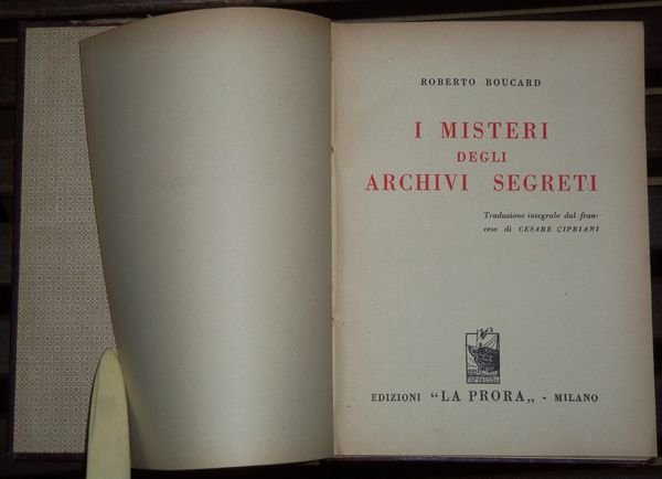 [Spionaggio](cm. 20) cartonato editoriale, dorso in similtela, con titolo in oro al dorso. Frontespizio in rosso e nero. -pp. 176 stampato su carta filigranata avorio, brossura cucita. varie illustrazioni a piena pagina fuori testo. In questo volume Boucard, racconta segreti di stato, astuzie dello spionaggio, rivelando il contenuto di misteriosi documenti che come lo stesso dice in prefazione: "un caso provvidenziale ha rivelato alla mia curiosit‡". Inevitabili segni del tempo ai margini del cartonato, ma assolutamente ottime condizioni. [n45]