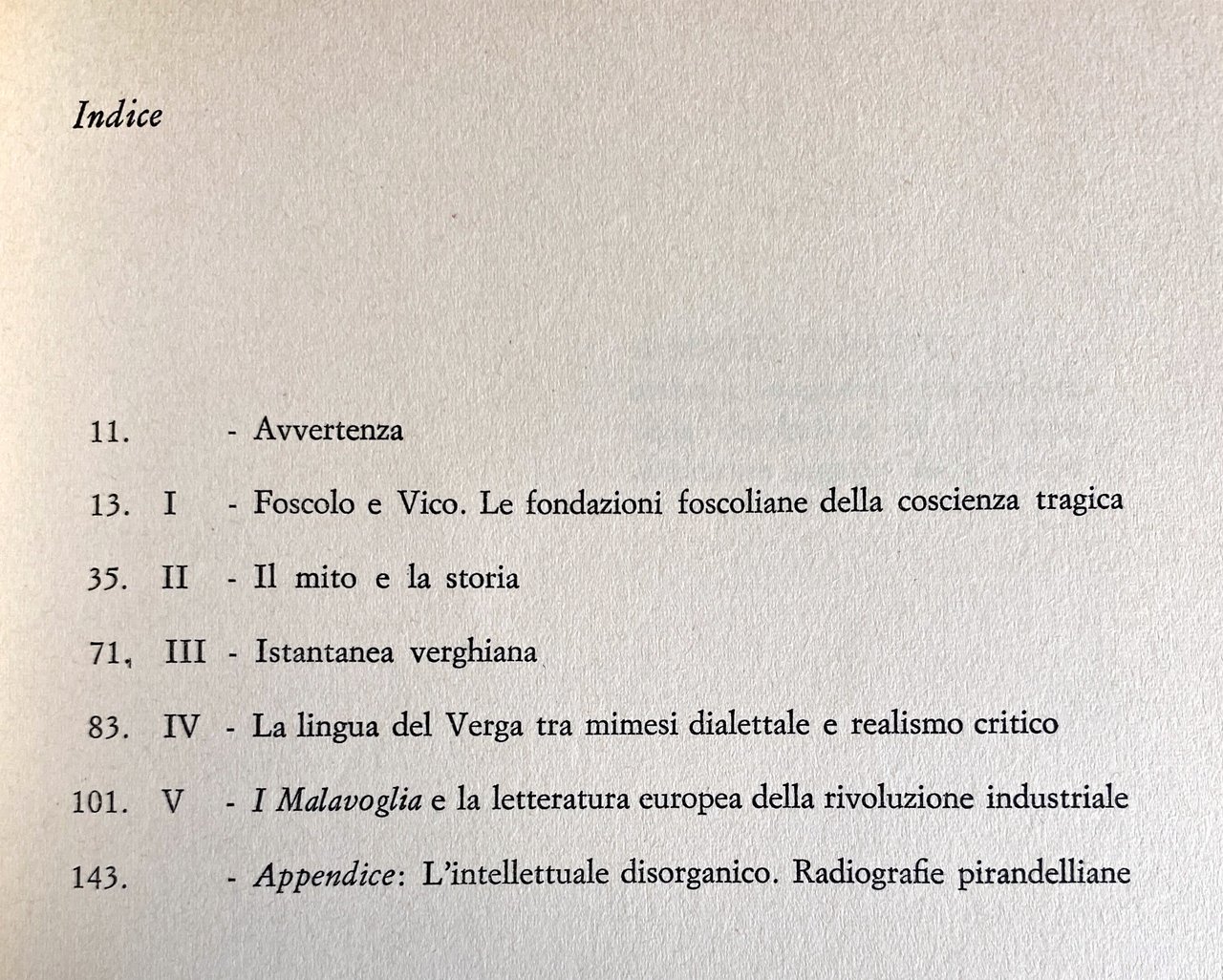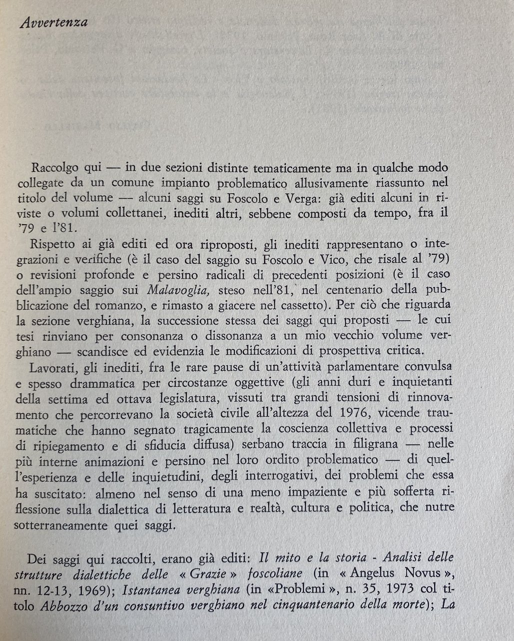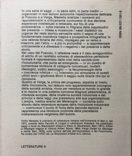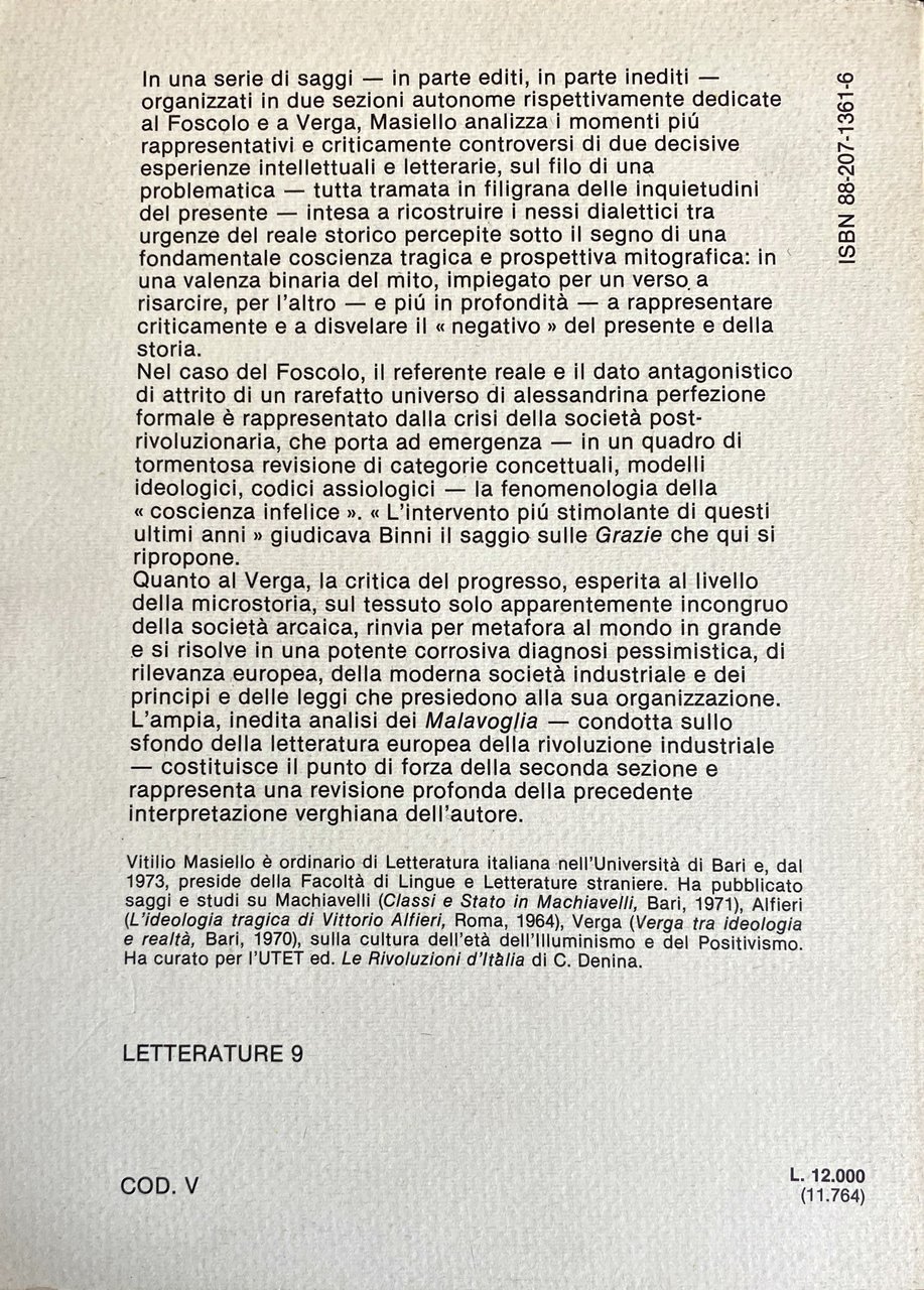 Soggetti: Critica letteraria Linguistica Filologia Lingua Letteratura italiana Correnti letterarie Verismo Giovanni Verga Ugo Foscolo Poesia Poetica Opere generali critiche Parallelismi Confronti Mitologia Storia Studi letterari Malavoglia Romanzi Settecento, Ideologia Realtà Mastro don Gesualdo Aci Castello Trezza Nedda Novelle Sicilia Padron Ntoni Coscienza tragica Crisi Progresso Influenze culturali Mitografia Dialetto Carlo Imbonati Intellettuale disorganico Pirandello Pessimismo Società Industria culturale Carme foscoliano Grazie Funzione civile Luigi Capuana Spinazzola L'amante di Gramigna Etica Fantasticheria Fascismo Rosso Malpelo Rusticane Personaggi Ideali Mondo popolare, Libri Vintage, Fuori catalogo Saggi inediti Antologie Collezionismo Bibliografia Riferimento Raccolte Mito Analisi Strutture dialettiche Grazie foscoliane Angelus Novus Istantanea verghiana Problemi Abbozzo d'un consuntivo verghiano nel cinquantenario della morte Mimesi dialettale Realismo critico Caso Giambattista Vico Fondazioni Rivoluzione industriale Eredità Vichiana Archetipi Mazzacurati Storiografia Momigliano Segre Classicismo Naturalismo Sepolcri Estetica Walter Binni Giaime Pintor Adorno Cirese Folklore Intellettuali Giovani Vecchi Deledda Scotellaro Luperini Ottocento Novecento Capitalismo Classi sociali Povertà Ultimi Vinti Fasci siciliani Questione meridionale Caterina Laurentano Condizione minorile Contadini Darwinismo sociale Vitangelo Moscarda Dialettica Literary criticism Linguistics Philology Language Italian literature Currents Verism Poetry Poetics General critical works Parallelisms Comparisons Mythology History Studies Novels Eighteenth century Ideology Reality Short stories Sicily Tragic consciousness Crisis Progress Cultural influences Mythography Dialect Disorganized intellectual Pessimism Society Industry Poem Thanks Civil function Ethics Daydreaming Fascism Characters Ideals Popular world Books Out of print Unpublished essays Anthologies Collectibles Bibliography Reference Collections Myth Analysis Dialectical structures Snapshot Problems Dialectal mimesis Realism Case Industrial revolution Heritage Archetypes Historiography Classicism Naturalism Sepulchres Aesthetics Intellectuals Young Old Nineteenth Twentieth Capitalism Social classes Poverty Last Vanquished Southern question Condition of minors Peasants Darwinism Dialectic