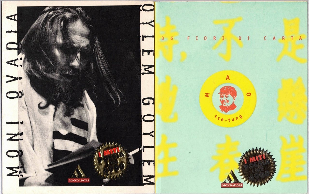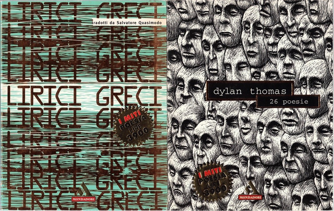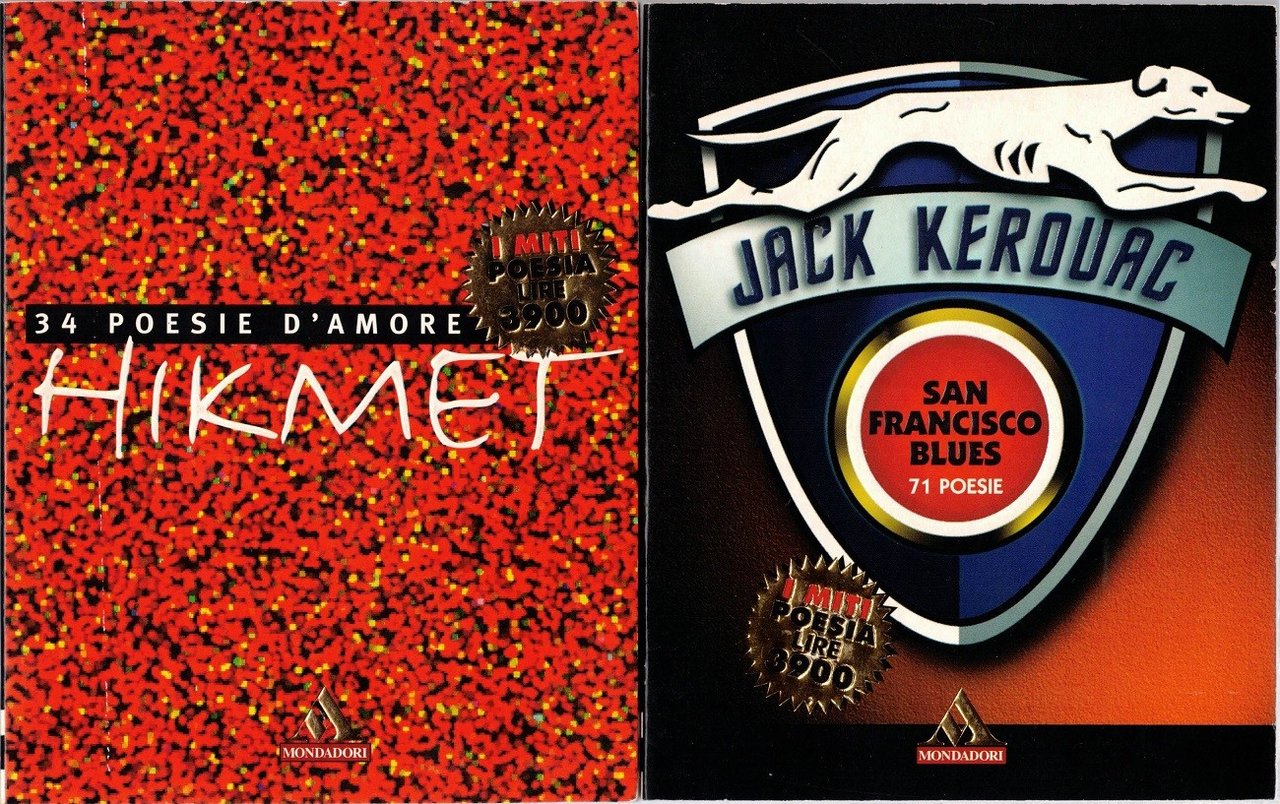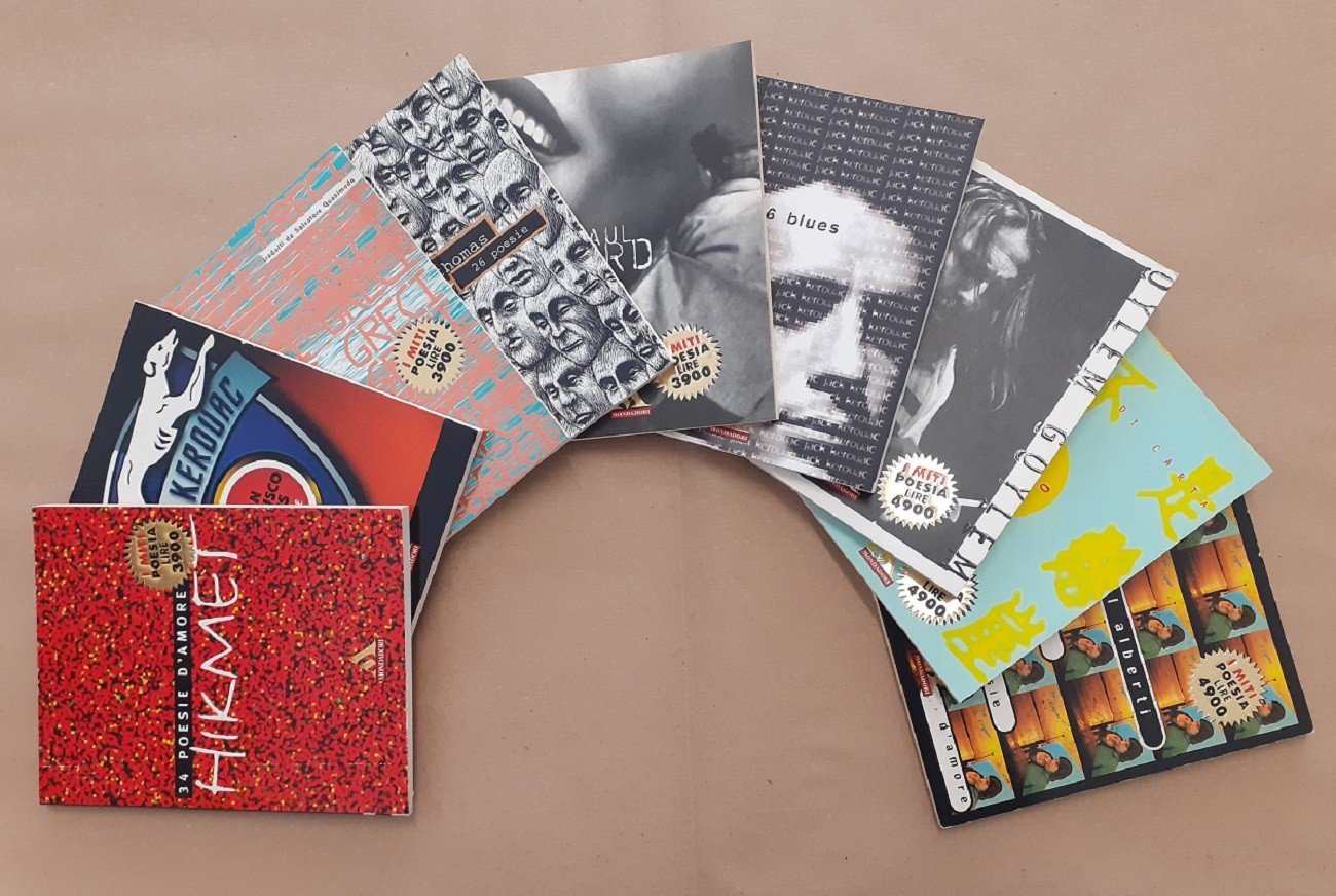 Il lotto comprende 9 volumi della collana I miti. Poesia, Arnoldo Mondadori Editore, Milano 1996-1998, pp. 618 totali, cm 16, br. ed. Dettaglio lotto: Nazim Hikmet, 34 poesie d’amore, traduzione di Joyce Lussu, Arnoldo Mondadori Editore, Milano 1996, prima ed., pp. 67, cm 16, br. ed. (collana I miti. Poesia, vol. 2) – Jack Kerouac, San Francisco Blues. 71 poesie, traduzione di Massimo Bocchiola, Arnoldo Mondadori Editore, Milano 1996, prima ed., pp. 66, cm 16, br. ed. (collana I Miti. Poesia, vol. 17) – Lirici greci, tradotti da Salvatore Quasimodo, Arnoldo Mondadori Editore, Milano 1996, pp. 64, cm 16, br. ed. (collana I Miti. Poesia, vol. 19) – Dylan Thomas, 26 poesie, traduzione di Ariodante Marianni, Arnoldo Mondadori Editore, Milano 1997, prima ed., pp. 66, cm16, br. ed. (collana I miti. Poesia, vol. 30) – Paul Eluard, 44 poesie, traduzione di Vincenzo Accame, Arnoldo Mondadori Editore, Milano 1997, prima ed., pp. 64, cm 16, br. ed. (collana I Miti. Poesia, vol. 42) – Jack Kerouac, 36 blues, traduzione di Massimo Bocchiola, Arnoldo Mondadori Editore, Milano 1998, prima ed., pp. 62, cm 16, br. ed. Moni Ovadia, Oylem goylem. (Il mondo è scemo), Arnoldo Mondadori Editore, Milano 1998, pp. 89, c, 16, br. ed. (collana I Miti. Poesia, vol. 54) – Mao Tse-tung, 36 fiori di carta, traduzione di Renata Pisu, Arnoldo Mondadori Editore, Milano 1998, pp. 76, ill. col., cm 16, br. ed. (collana I Miti. Poesia, vol. 55) – Rafael Alberti, 47 poesie d’amore, traduzione di Marcella Eusebi Ciceri, Arnoldo Mondadori Editore, Milano 1998, pp. 64, cm 16, br. ed. (collana I Miti. Poesia, vol. 56). Tutti i volumi fanno parte della prima ed. della collana I Miti. Poesia. Accenni di fioriture al taglio superiore dei volumi, minima brunitura della carta, per il resto perfetti.