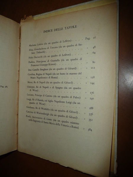 DESCRIZIONE: Ed. Staderini, Roma, 1936-XIV. In 8°, leg. coeva tela rossa con cop. ill. b/n della br. originale applicata al piatto, 414 pp. con 13 ill. b/n f.t. Indice: Prefazione; Introduzione; Madama Letizia (1750-1836); Elisa Granduchessa di Toscana (1777-1820); Paolina Principessa di Guastalla (1780-1825); Carolina Regina di Napoli (1782-1839); Giuseppe Re di Napoli e di Spagna (1768-1844); Luciano Principe di Canino (1775-1849); Luigi Re d'Olanda (1778-1846); Girolamo Re di Westfalia (1784-1860); Fesch Arcivescovo di Lione (1763-1839); Indice delle tavole. CONDIZIONI: Accettabile. Dorso scollato, abrasioni sul retro, leg. separata in un paio di punti, macchie di muffa in quarta di cop. e seconda di cop. PESO / WEIGHT: 700 gr. without package