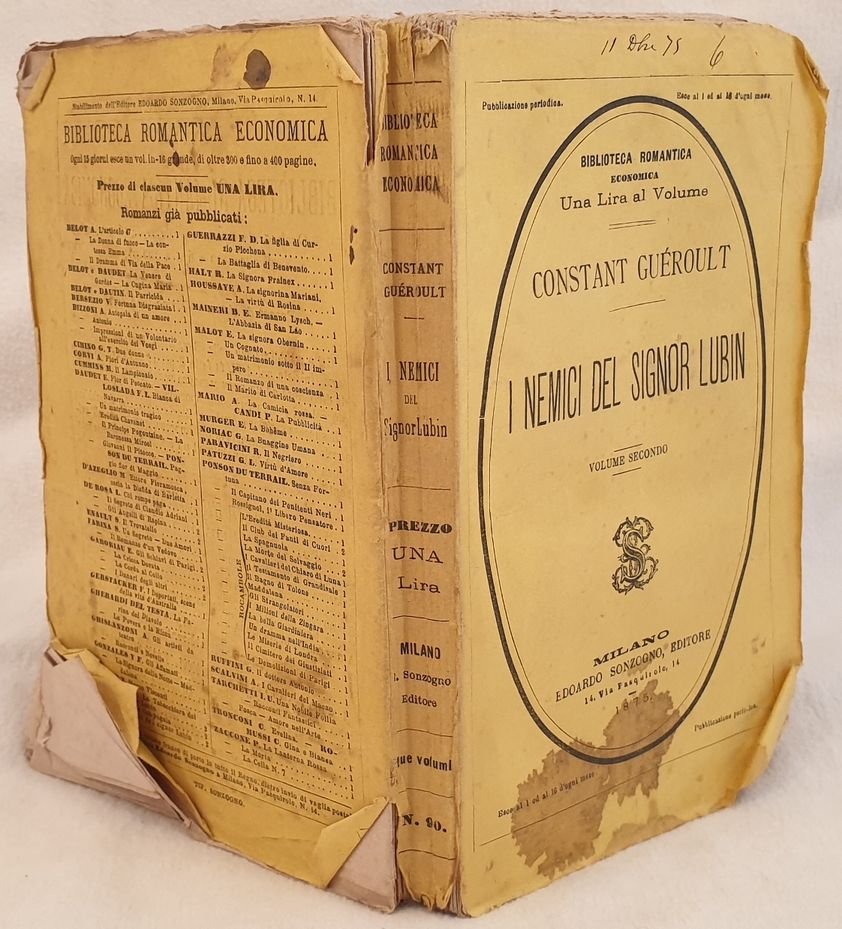 Edizione del 1875 di questo romanzo di Constant Gueroult. L'opera era composta da due volumi, siamo purtroppo in possesso del tomo secondo. In buone condizioni. Copertina editoriale in buone condizioni generali con lievi usure ai margini e dorso. Macchie. Legatura in buone condizioni. All'interno le pagine si presentano in buone condizioni con rare fioriture. Piegature agli angoli. In 16. Dim. 18,5x12,5 cm. Pp. 368. Edition of 1875 of this novel by Constant Gueroult. The work was made up of two volumes, unfortunately we onyl have the second tome. In good conditions. Editorial cover in good conditions slightly worn inthe edges and spine. Binding in good conditions. Pages in good conditions with occasional foxings. Foldings in the corners. In 16. Dim. 18,5x12,5 cm. Pp. 368.