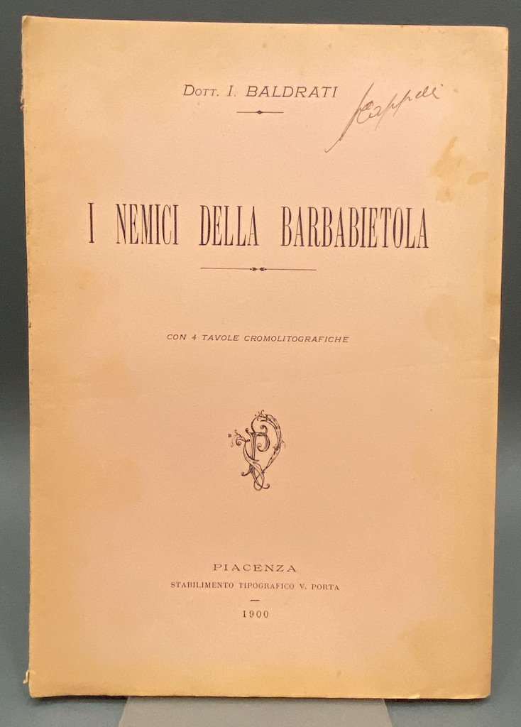 Brossura editoriale a stampa, cm 26x18, pp 40 + 4 tavole cromolitografiche a colori (Cromolitografia Fran. Casanova e Figlio, Bologna).