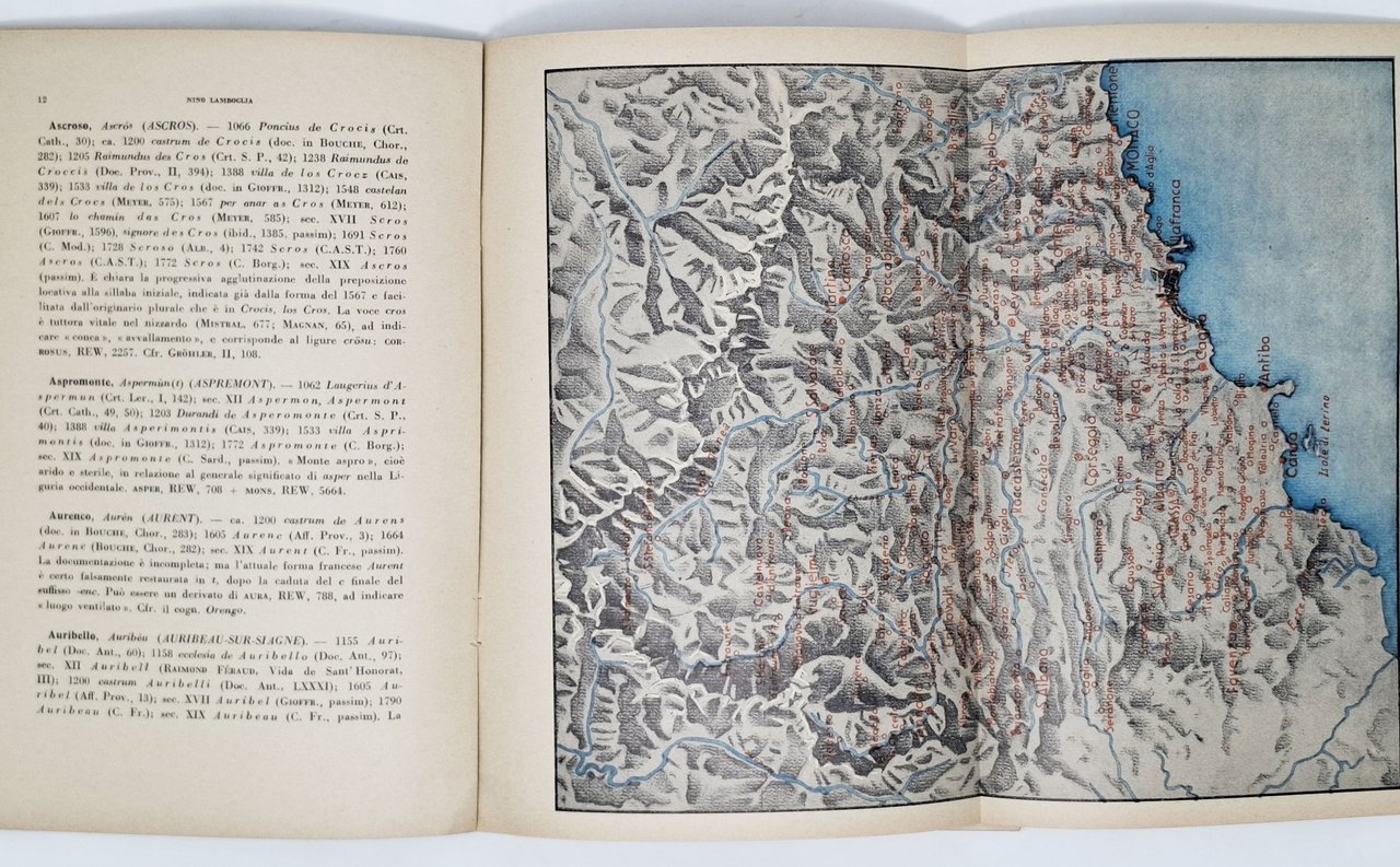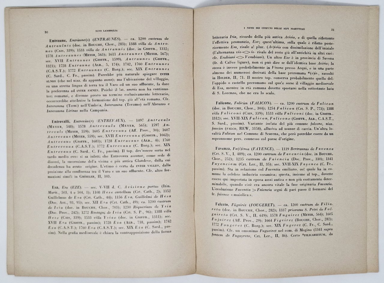 Estratto dalla Rivista di Studi Liguri / seguito alla Rivista Ingauna Intemelia - Anno VIII (1942) - n. 2. Pagine: 60. Formato: 17 x 24,5 cm circa. Buon esemplare, privo di timbri, firme d'appartenenza, annotazioni, sottolineature o altri segni nel testo. In brossura. Con bella carta geografica a colori, piegata su se stessa, fuori testo. Sono riportati, in ordine alfabetico, tutti i comuni delle Alpi Marittime e per ognuno di essi sono citati i vari nomi cn cui furono chiamati nel corso della storia. Di non facile reperimento.