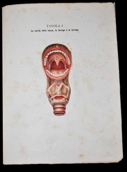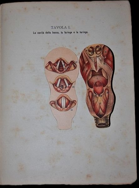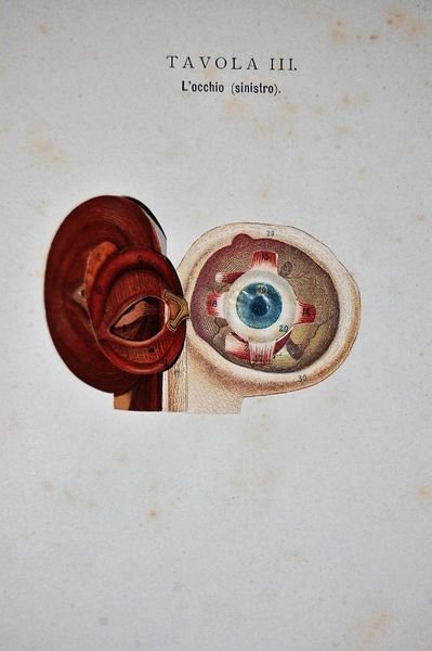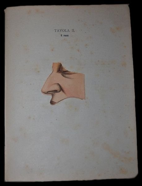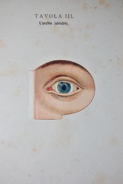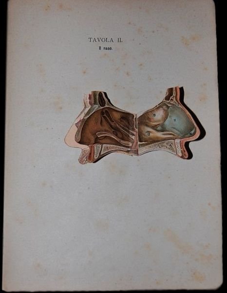 28×20,7 cm; 18 pp. e 4 c. di tav. fuori testo. Legatura editoriale con titolo impresso in nero e rosso al piatto anteriore e dorso in tela rossa. 4 bellissime tavole a colori con i componenti di naso, bocca, orecchio, occhio composti da figure sovrapponibili in stile decupage. Il testo è opera del noto medico veronese Orsino Manganotti che si laureò con una tesi inerente Il metodo abortivo nella cura delle malattie veneree e fu traduttore di numerose pubblicazioni mediche. Piccolo strappetto, ininfluente, senza perdita di carta nel margine basso bianco, leggerissime e non fastidiose macchioline di foxing nella parte bianca delle tavole e per il resto in buono-ottimo stato di conservazione. Prima edizione stampata della stamperia veneta dei fratelli Drucker di questa pubblicazione italiana che riprende la moda ottocentesca tedesca delle figure scomponibili. Le edizioni italiane ottocentesche scomponibili sono assai rare. Nessun esemplare censito in ICCU. RARO.