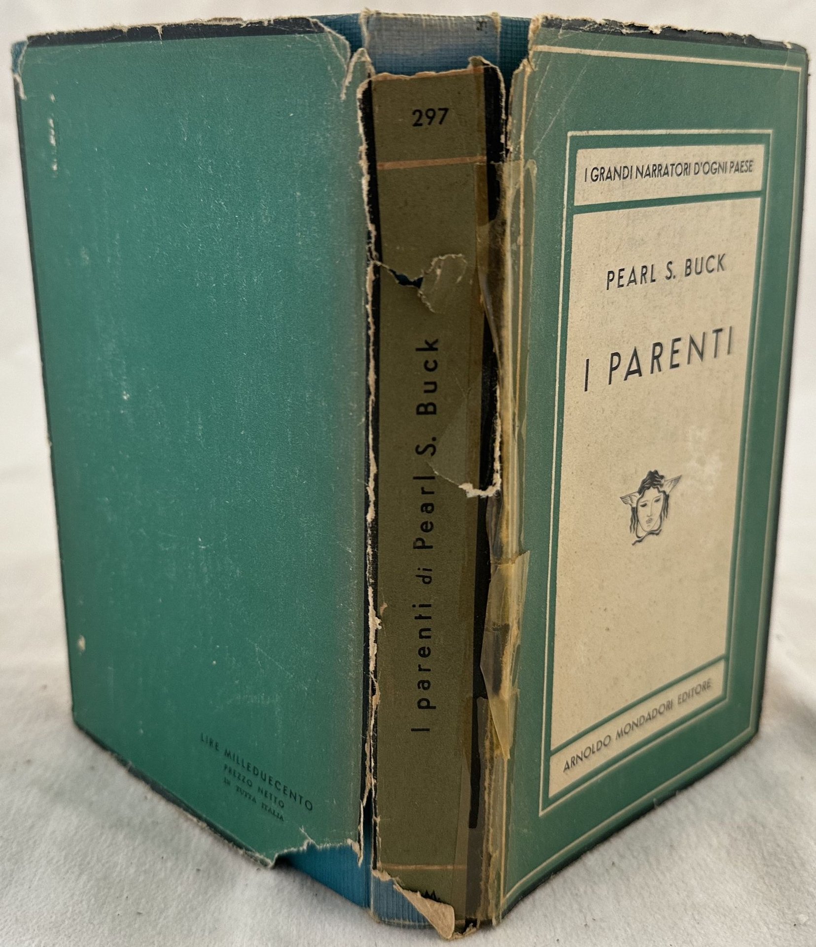 Prima edizione italiana del giugno 1952 del romanzo "I parenti" dello scrittore Pearl S. Buck. Volume numero 297 della collana "Medusa". In ottime condizioni. Copertina editoriale in ottime condizioni generali con lievi usure ai margini e dorso. Sovracoperta con usure e mancanze in mediocri condizioni. Nastro adesivo applicato. Legatura in buone condizioni. Pagine in ottime condizioni con rare fioriture. In 8. cm 19,5x12. Pp.453+(9).First italian edition of june 1952 of the novel "I parenti" by the american writer Pearl S. Buck. Volume number 297 of the series "Medusa". In very good conditions Editorial cover in very good conditions lightly worn in the extremities. Dustjacket with wearings and lackings in poor conditions. Adhesive tape applied. Binding in good condition. Pages in very good conditions with occasional foxing. In 8. cm 19,5x12. Pp.453+(9).