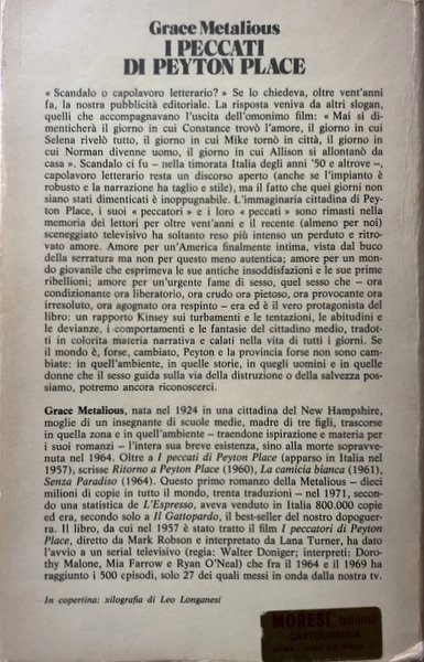 Soggetti: Letteratura americana, Narrativa, Romanzi, Novecento, New England, Critica sociale, Libri Vintage, Fuori catalogo, Classici, Leslie Harrington, Tomas Makris, Allison MacKenzie, Selena Cross, Gli scandalosi anni cinquanta, Anni Quaranta, Ritorno, Sequel, Scrittrici, Donne, Borghesia, Cultura popolare, American popular culture, Comunità, Città immaginaria, Tradimenti, Scandali, Perbenismo, Serie TV, Sesso, Famiglia, Morale, Moralismo, Intransigenza, Sogno americano, Segreti, Adolescenti, Adulti, White River, John Anderson, Charles Partridge, Chestnut Street, Matthew Swain, Norman Page, Witcher, Nellie Cross, Sensualità, Provincia, Omicidi, Cultura di massa, Best sellers, Pandora in blue jeans, Peccati, Peccatori, Società, Turbamenti, Devianze, Salvezza, Distruzione, Intrighi, Relazioni, American Literature, Fiction, Novels, Twentieth Century, Social Criticism, Out of Catalog Books, Classics, The Scandalous Fifties, Forties, Sequel, Writers, Women, Bourgeoisie, Popular Culture, American Popular Culture, Community, Imaginary City, Betrayals, Scandals, Respect, TV series, Sex, Family, Moralism, Moralism, Intransigence, American dream, Secrets, Teens, Adults, Sensuality, Province, Mass culture, Sins, Sinners, Societies, Murders, Disruptions, Deviations, Salvation, Destruction, Intrigues, Relationships