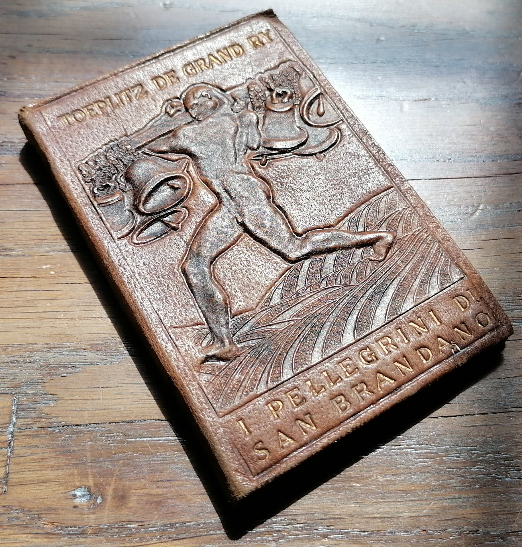 Cm 9,5 x 6, legatura editoriale in pieno cuoio sbalzato con titoli in oro, al dorso il logo "Costruire" e numerazione impressa a secco, al piatto anteriore figura a rilievo su disegno di Duilio Cambellotti, guardie figurate, pp. 133,(3). Raccolta di Breviari Intellettuali, n. 290. Ottimo stato.